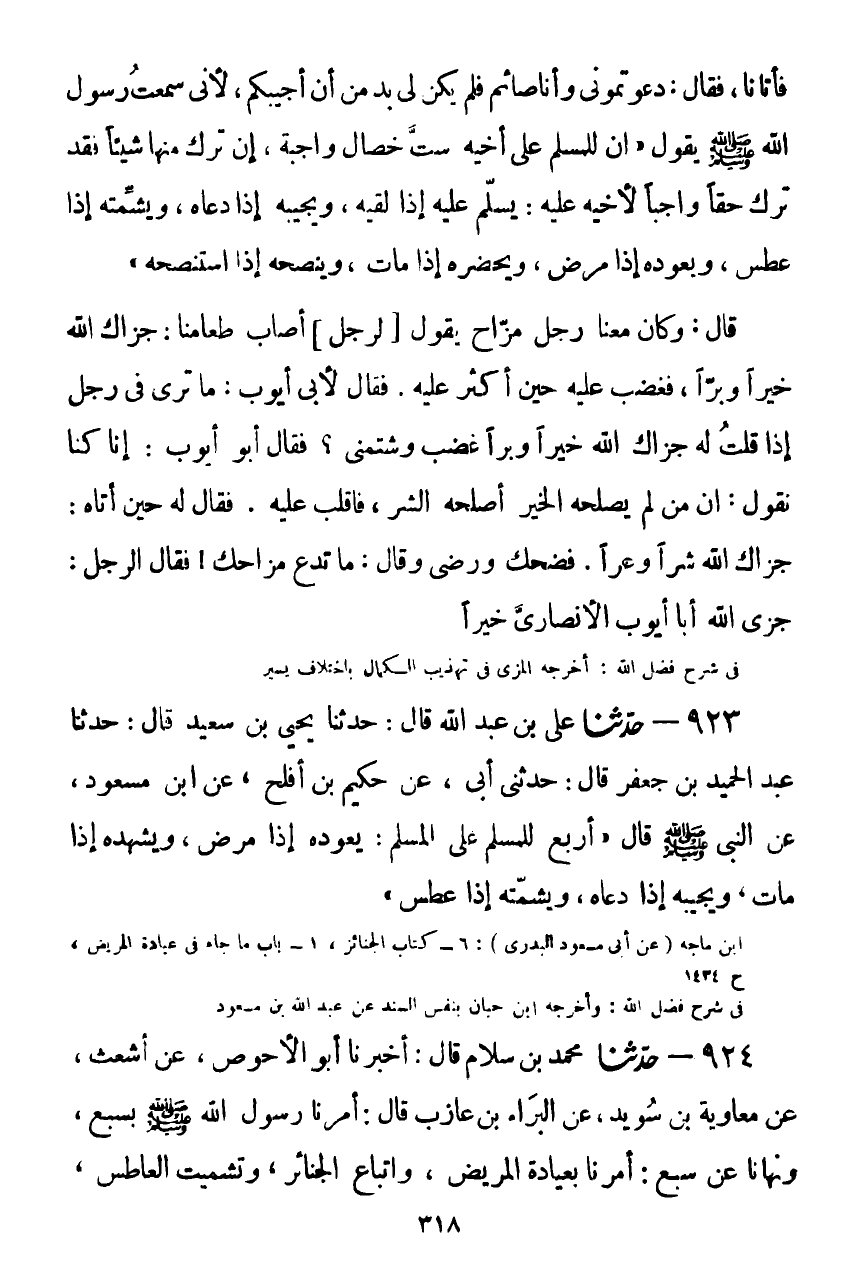923 - حَدَّثَنَا عَلِيُّ بْنُ عَبْدِ اللَّهِ قَالَ: حَدَّثَنَا يَحْيَى بْنُ سَعِيدٍ قَالَ: حَدَّثَنَا عَبْدُ الْحَمِيدِ بْنُ جَعْفَرٍ قَالَ: حَدَّثَنِي أَبِي، عَنْ حَكِيمِ بْنِ أَفْلَحَ، عَنِ ابْنِ مَسْعُودٍ، عَنِ النَّبِيِّ صَلَّى اللهُ عَلَيْهِ وَسَلَّمَ قَالَ: " §أَرْبَعٌ لِلْمُسْلِمِ عَلَى الْمُسْلِمِ: يَعُودُهُ إِذَا مَرِضَ، وَيَشْهَدُهُ إِذَا مَاتَ، وَيُجِيبُهُ إِذَا دَعَاهُ، وَيُشَمِّتُهُ إِذَا عَطَسَ "Kصحيح