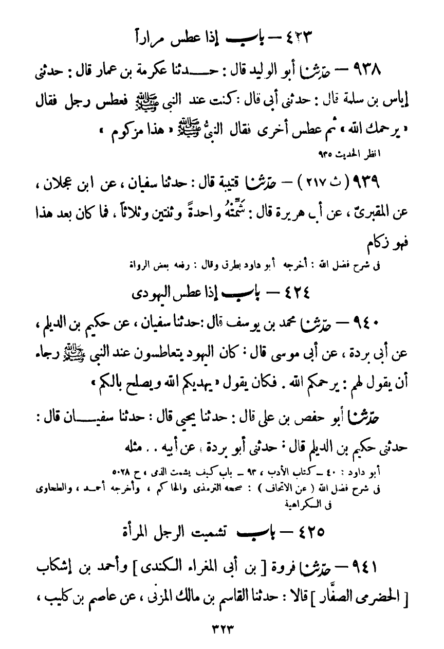 940 - حَدَّثَنَا مُحَمَّدُ بْنُ يُوسُفَ قَالَ: حَدَّثَنَا سُفْيَانُ، عَنْ حَكِيمِ بْنِ الدَّيْلَمِ، عَنْ أَبِي بُرْدَةَ، عَنْ أَبِي مُوسَى قَالَ: كَانَ الْيَهُودُ يَتَعَاطَسُونَ عِنْدَ النَّبِيِّ صَلَّى اللهُ عَلَيْهِ وَسَلَّمَ رَجَاءَ أَنْ يَقُولَ لَهُمْ: يَرْحَمُكُمُ اللَّهُ، فَكَانَ يَقُولُ: «§يَهْدِيكُمُ اللَّهُ، وَيُصْلِحُ بَالَكُمْ»