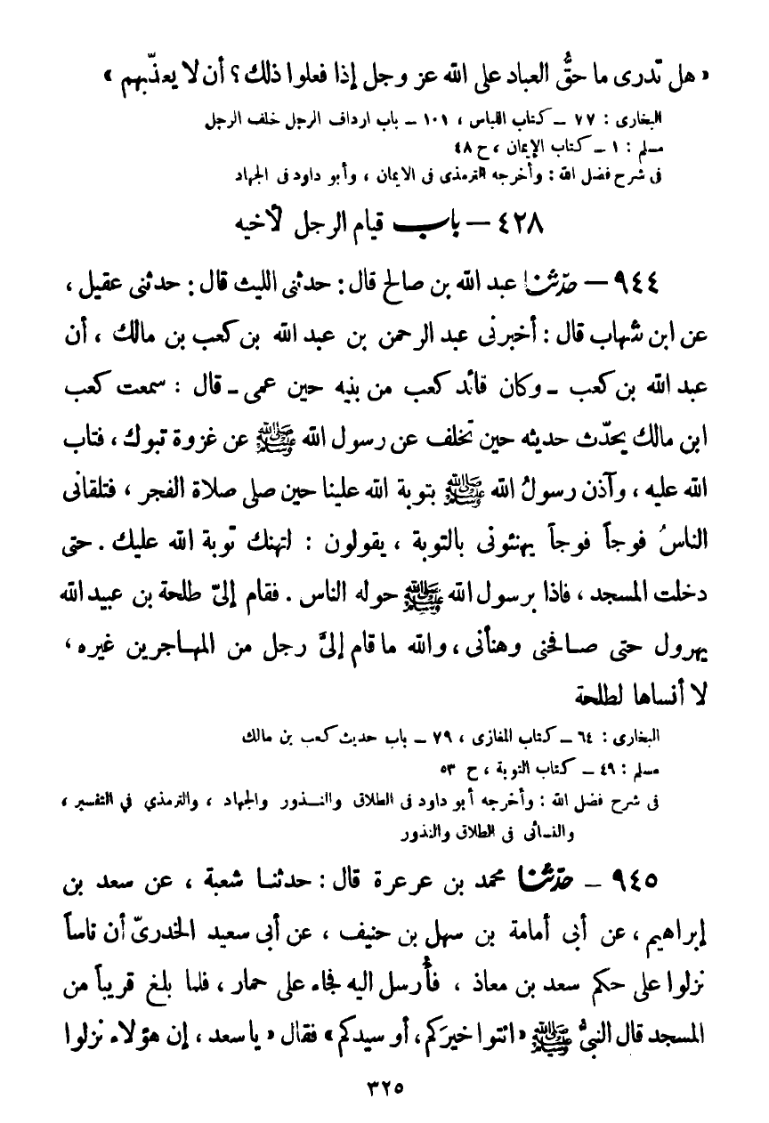 944 - حَدَّثَنَا عَبْدُ اللَّهِ بْنُ صَالِحٍ قَالَ: حَدَّثَنِي اللَّيْثُ قَالَ: حَدَّثَنِي عُقَيْلٌ، عَنِ ابْنِ شِهَابٍ قَالَ: أَخْبَرَنِي عَبْدُ الرَّحْمَنِ بْنُ عَبْدِ اللَّهِ بْنِ كَعْبِ بْنِ مَالِكٍ، أَنَّ عَبْدَ اللَّهِ بْنَ كَعْبٍ - وَكَانَ قَائِدَ كَعْبٍ مِنْ بَنِيهِ حِينَ عَمِيَ - قَالَ: سَمِعْتُ كَعْبَ بْنَ مَالِكٍ يُحَدِّثُ حَدِيثَهُ حِينَ تَخَلَّفَ عَنْ رَسُولِ اللَّهِ صَلَّى اللهُ عَلَيْهِ وَسَلَّمَ عَنْ غَزْوَةِ تَبُوكَ، فَتَابَ اللَّهُ عَلَيْهِ: §وَآذَنَ رَسُولُ اللَّهِ صَلَّى اللهُ عَلَيْهِ وَسَلَّمَ بِتَوْبَةِ اللَّهِ عَلَيْنَا حِينَ صَلَّى صَلَاةَ الْفَجْرَ، فَتَلَقَّانِي النَّاسُ فَوْجًا فَوْجًا، يُهَنُّونِي بِالتَّوْبَةِ يَقُولُونَ: لِتَهْنِكَ تَوْبَةُ اللَّهِ عَلَيْكَ، حَتَّى دَخَلْتُ الْمَسْجِدَ، فَإِذَا بِرَسُولِ اللَّهِ صَلَّى اللهُ عَلَيْهِ وَسَلَّمَ حَوْلَهُ النَّاسُ، فَقَامَ إِلَيَّ طَلْحَةُ بْنُ عُبَيْدِ اللَّهِ يُهَرْوِلُ، حَتَّى صَافَحَنِي وَهَنَّانِي، وَاللَّهِ مَا قَامَ إِلَيَّ رَجُلٌ مِنَ الْمُهَاجِرِينَ غَيْرُهُ، لَا أَنْسَاهَا لِطَلْحَةَKصحيح