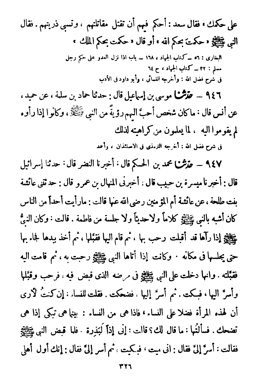 947 - حَدَّثَنَا مُحَمَّدُ بْنُ الْحَكَمِ قَالَ: أَخْبَرَنَا النَّضْرُ قَالَ: حَدَّثَنَا إِسْرَائِيلُ قَالَ: أَخْبَرَنَا مَيْسَرَةُ بْنُ حَبِيبٍ قَالَ: أَخْبَرَنِي الْمِنْهَالُ بْنُ عَمْرٍو قَالَ: حَدَّثَتْنِي عَائِشَةُ بِنْتُ طَلْحَةَ، عَنْ عَائِشَةَ أُمِّ الْمُؤْمِنِينَ رَضِيَ اللَّهُ عَنْهَا قَالَتْ: مَا رَأَيْتُ أَحَدًا مِنَ النَّاسِ كَانَ §أَشْبَهَ بِالنَّبِيِّ صَلَّى اللهُ عَلَيْهِ وَسَلَّمَ كَلَامًا وَلَا حَدِيثًا وَلَا جِلْسَةً مِنْ فَاطِمَةَ، قَالَتْ: وَكَانَ النَّبِيُّ صَلَّى اللهُ عَلَيْهِ وَسَلَّمَ إِذَا رَآهَا قَدْ أَقْبَلَتْ رَحَّبَ بِهَا، ثُمَّ قَامَ إِلَيْهَا فَقَبَّلَهَا، ثُمَّ أَخَذَ بِيَدِهَا فَجَاءَ بِهَا حَتَّى يُجْلِسَهَا فِي مَكَانِهِ، وَكَانَتْ إِذَا أَتَاهَا النَّبِيُّ صَلَّى اللهُ عَلَيْهِ وَسَلَّمَ رَحَّبَتْ بِهِ، ثُمَّ قَامَتْ إِلَيْهِ فَقَبَّلَتْهُ، وأَنَّهَا دَخَلَتْ عَلَى النَّبِيِّ صَلَّى اللهُ عَلَيْهِ وَسَلَّمَ فِي مَرَضِهِ الَّذِي قُبِضَ فِيهِ، فَرَحَّبَ وَقَبَّلَهَا، وَأَسَرَّ إِلَيْهَا، فَبَكَتْ، ثُمَّ أَسَرَّ إِلَيْهَا، فَضَحِكَتْ، فَقُلْتُ لِلنِّسَاءِ: إِنْ كُنْتُ لَأَرَى أَنَّ لِهَذِهِ الْمَرْأَةِ فَضْلًا عَلَى النِّسَاءِ، فَإِذَا هِيَ مِنَ النِّسَاءِ، بَيْنَمَا هِيَ تَبْكِي إِذَا هِيَ تَضْحَكُ، فَسَأَلْتُهَا: مَا قَالَ لَكِ؟ قَالَتْ: إِنِّي إِذًا لَبَذِرَةٌ، فَلَمَّا قُبِضَ النَّبِيُّ صَلَّى اللهُ عَلَيْهِ وَسَلَّمَ، فَقَالَتْ: أَسَرَّ إِلَيَّ فَقَالَ: «إِنِّي مَيِّتٌ» ، فَبَكَيْتُ، ثُمَّ أَسَرَّ إِلَيَّ فَقَالَ: «إِنَّكِ أَوَّلُ أَهْلِي بِي لُحُوقًا» ، فَسُرِرْتُ بِذَلِكَ وَأَعْجَبَنِيKصحيح