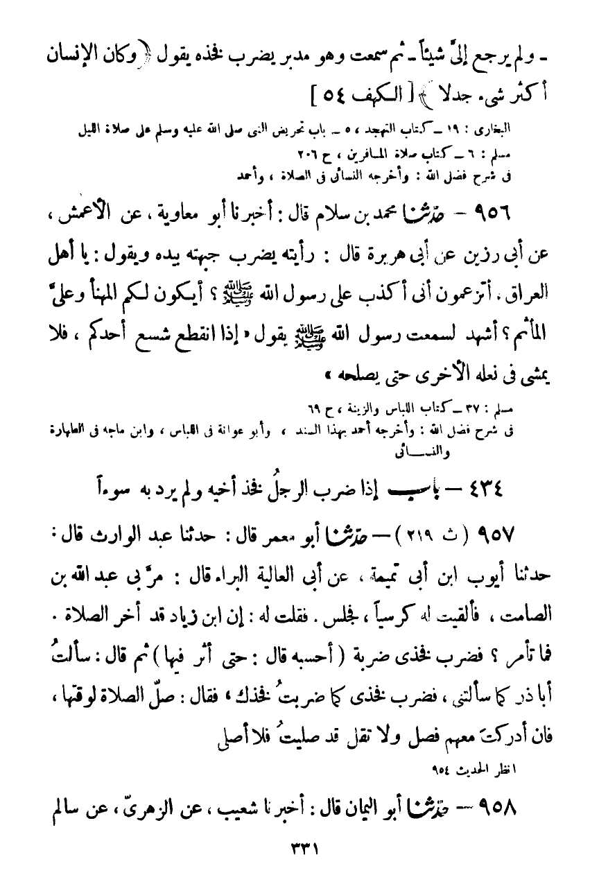 956 - حَدَّثَنَا مُحَمَّدُ بْنُ سَلَّامٍ قَالَ: أَخْبَرَنَا أَبُو مُعَاوِيَةَ، عَنِ الْأَعْمَشِ، عَنْ أَبِي رَزِينٍ، عَنْ أَبِي هُرَيْرَةَ قَالَ: رَأَيْتُهُ يَضْرِبُ جَبْهَتَهُ بِيَدِهِ وَيَقُولُ: يَا أَهْلَ الْعِرَاقِ، أَتَزْعُمُونَ أَنِّي أَكْذِبُ عَلَى رَسُولِ اللَّهِ صَلَّى اللهُ عَلَيْهِ وَسَلَّمَ، أَيَكُونُ لَكُمُ الْمَهْنَأُ وَعَلَيَّ الْمَأْثَمُ؟ أَشْهَدُ لَسَمِعْتُ رَسُولَ اللَّهِ صَلَّى اللهُ عَلَيْهِ وَسَلَّمَ يَقُولُ: «§إِذَا انْقَطَعَ شِسْعُ نَعْلِ أَحَدِكُمْ، فَلَا يَمْشِي فِي نَعْلِهِ الْأُخْرَى حَتَّى يُصْلِحَهُ» Kصحيح