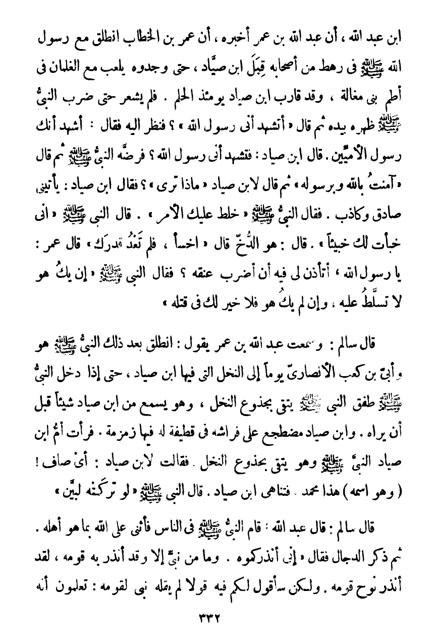 قَالَ سَالِمٌ: فَسَمِعْتُ عَبْدَ اللَّهِ بْنَ عُمَرَ يَقُولُ: انْطَلَقَ بَعْدَ ذَلِكَ النَّبِيُّ صَلَّى اللهُ عَلَيْهِ وَسَلَّمَ هُوَ وَأُبَيُّ بْنُ كَعْبٍ الْأَنْصَارِيُّ يَوْمًا إِلَى النَّخْلِ الَّتِي فِيهَا ابْنُ صَيَّادٍ، حَتَّى إِذَا دَخَلَ النَّبِيُّ صَلَّى اللهُ عَلَيْهِ وَسَلَّمَ طَفِقَ النَّبِيُّ صَلَّى اللهُ عَلَيْهِ وَسَلَّمَ يَتَّقِي بِجُذُوعِ النَّخْلِ، وَهُوَ يَسْمَعُ مِنِ ابْنِ صَيَّادٍ شَيْئًا قَبْلَ أَنْ يَرَاهُ، وَابْنُ صَيَّادٍ مُضْطَجِعٌ عَلَى فِرَاشِهِ فِي قَطِيفَةٍ لَهُ فِيهَا زَمْزَمَةٌ، فَرَأَتْ أُمُّ ابْنِ صَيَّادٍ النَّبِيَّ صَلَّى اللهُ عَلَيْهِ وَسَلَّمَ وَهُوَ يَتَّقِي بِجُذُوعِ النَّخْلِ، فَقَالَتْ لِابْنِ صَيَّادٍ: أَيْ صَافُ - وَهُوَ اسْمُهُ - هَذَا مُحَمَّدٌ، فَتَنَاهَى ابْنُ صَيَّادٍ، قَالَ النَّبِيُّ صَلَّى اللهُ عَلَيْهِ وَسَلَّمَ: «§لَوْ تَرَكَتْهُ لَبَيَّنَ»
