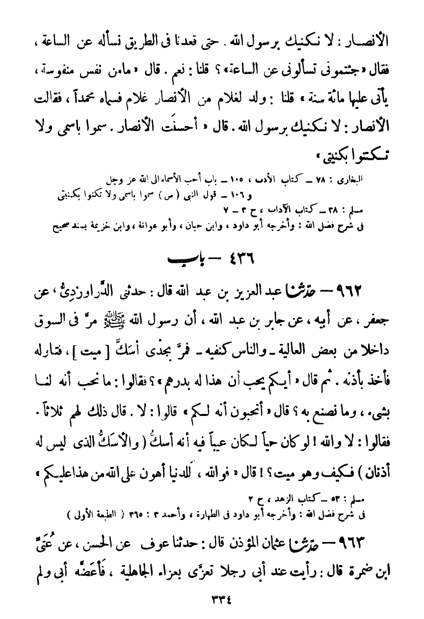 962 - حَدَّثَنَا عَبْدُ الْعَزِيزِ بْنُ عَبْدِ اللَّهِ قَالَ: حَدَّثَنِي الدَّرَاوَرْدِيُّ، عَنْ جَعْفَرٍ، عَنْ أَبِيهِ، عَنْ جَابِرِ بْنِ عَبْدِ اللَّهِ، أَنَّ رَسُولَ اللَّهِ صَلَّى اللهُ عَلَيْهِ وَسَلَّمَ مَرَّ فِي السُّوقِ دَاخِلًا مِنْ بَعْضِ الْعَالِيَةِ وَالنَّاسُ كَنَفَيْهِ، فَمَرَّ بِجَدْيٍ أَسَكَّ، فَتَنَاوَلَهُ فَأَخَذَ بِأُذُنِهِ ثُمَّ قَالَ: «أَيُّكُمْ يُحِبُّ أَنَّ هَذَا لَهُ بِدِرْهَمٍ؟» فَقَالُوا: مَا نُحِبُّ أَنَّهُ لَنَا بِشَيْءٍ، وَمَا نَصْنَعُ بِهِ؟ قَالَ: «أَتُحِبُّونَ أَنَّهُ لَكُمْ؟» قَالُوا: لَا، قَالَ ذَلِكَ لَهُمْ ثَلَاثًا، فَقَالُوا: لَا وَاللَّهِ، لَوْ كَانَ حَيًّا لَكَانَ عَيْبًا فِيهِ أَنَّهُ أَسَكُّ - وَالْأَسَكُّ: الَّذِي لَيْسَ لَهُ أُذُنَانِ - فَكَيْفَ وَهُوَ مَيِّتٌ؟ قَالَ: «فَوَاللَّهِ، §لَلدُّنْيَا أَهْوَنُ عَلَى اللَّهِ مَنْ هَذَا عَلَيْكُمْ» Kصحيح