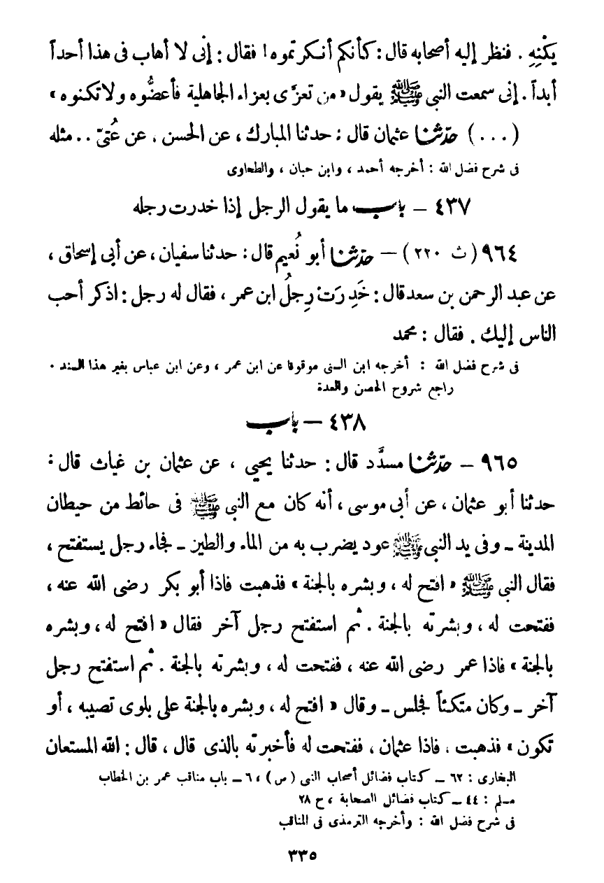 965 - حَدَّثَنَا مُسَدَّدٌ قَالَ: حَدَّثَنَا يَحْيَى، عَنْ عُثْمَانَ بْنِ غِيَاثٍ قَالَ: حَدَّثَنَا أَبُو عُثْمَانَ، عَنْ أَبِي مُوسَى، أَنَّهُ كَانَ مَعَ النَّبِيِّ صَلَّى اللهُ عَلَيْهِ وَسَلَّمَ فِي حَائِطٍ مِنْ حِيطَانِ الْمَدِينَةِ، وَفِي يَدِ النَّبِيِّ صَلَّى اللهُ عَلَيْهِ وَسَلَّمَ عُودٌ يَضْرِبُ بِهِ مِنَ الْمَاءِ وَالطِّينِ، فَجَاءَ رَجُلٌ يَسْتَفْتِحُ، فَقَالَ النَّبِيُّ صَلَّى اللهُ عَلَيْهِ وَسَلَّمَ: «§افْتَحْ لَهُ، وَبَشِّرْهُ بِالْجَنَّةِ» ، فَذَهَبَ، فَإِذَا أَبُو بَكْرٍ رَضِيَ اللَّهُ عَنْهُ، فَفَتَحْتُ لَهُ، وَبَشَّرْتُهُ بِالْجَنَّةِ. ثُمَّ اسْتَفْتَحَ رَجُلٌ آخَرُ، فَقَالَ: «افْتَحْ لَهُ، وَبَشِّرْهُ بِالْجَنَّةِ» ، فَإِذَا عُمَرُ رَضِيَ اللَّهُ عَنْهُ، فَفَتَحْتُ لَهُ، وَبَشَّرْتُهُ بِالْجَنَّةِ. ثُمَّ اسْتَفْتَحَ رَجُلٌ آخَرُ - وَكَانَ مُتَّكِئًا فَجَلَسَ - وَقَالَ: «افْتَحْ لَهُ، وَبَشِّرْهُ بِالْجَنَّةِ عَلَى بَلْوَى تُصِيبُهُ، أَوْ تَكُونُ» ، فَذَهَبْتُ، فَإِذَا عُثْمَانُ، فَفَتَحْتُ لَهُ، فَأَخْبَرْتُهُ بِالَّذِي قَالَ، قَالَ: اللَّهُ الْمُسْتَعَانُKصحيح