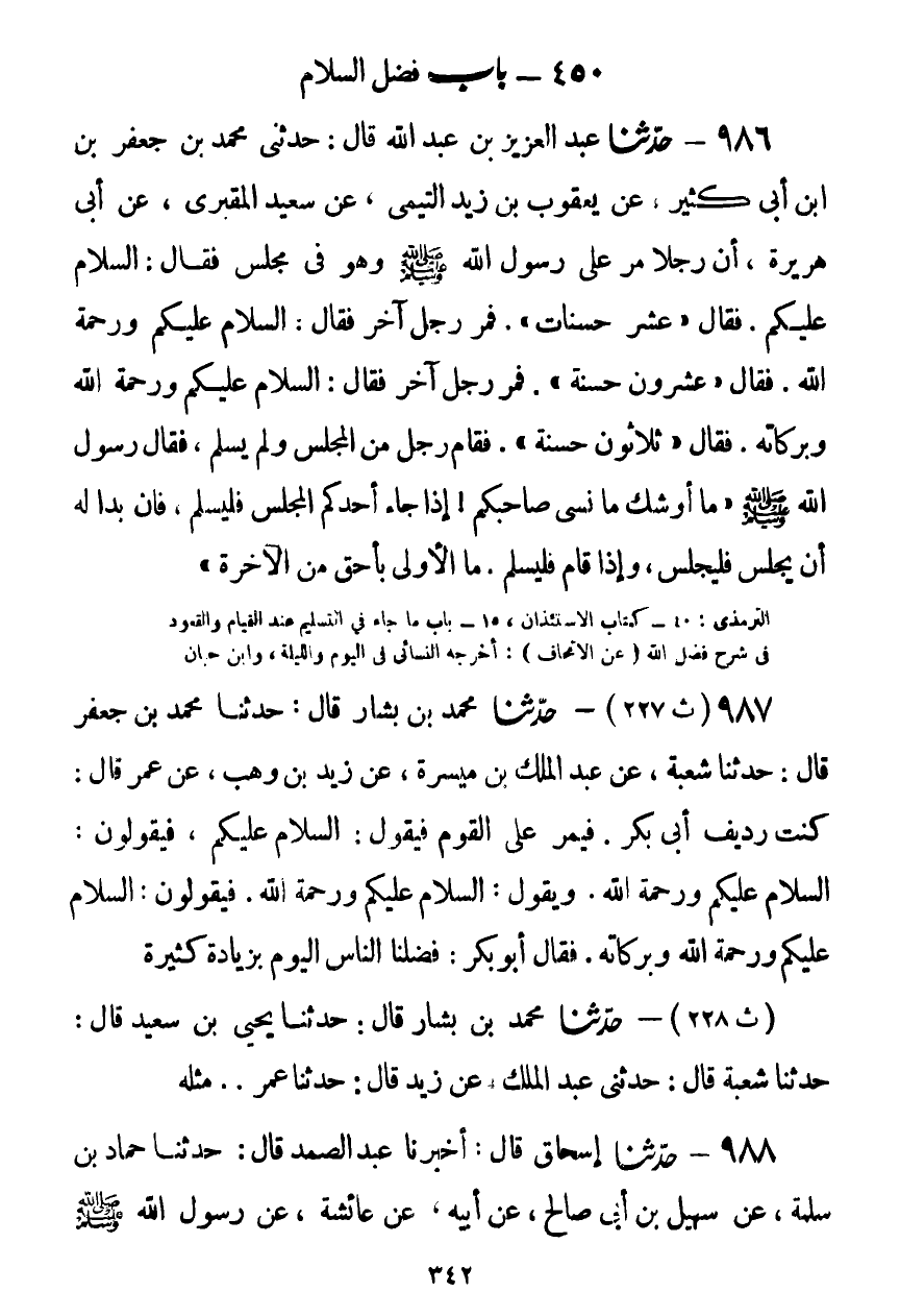 986 - حَدَّثَنَا عَبْدُ الْعَزِيزِ بْنُ عَبْدِ اللَّهِ قَالَ: حَدَّثَنِي مُحَمَّدُ بْنُ جَعْفَرِ بْنِ أَبِي كَثِيرٍ، عَنْ يَعْقُوبَ بْنِ زَيْدٍ التَّيْمِيِّ، عَنْ سَعِيدٍ الْمَقْبُرِيِّ، عَنْ أَبِي هُرَيْرَةَ، أَنَّ رَجُلًا مَرَّ عَلَى رَسُولِ اللَّهِ صَلَّى اللهُ عَلَيْهِ وَسَلَّمَ وَهُوَ فِي مَجْلِسٍ فَقَالَ: السَّلَامُ عَلَيْكُمْ، فَقَالَ: «عَشْرُ حَسَنَاتٍ» ، فَمَرَّ رَجُلٌ آخَرُ فَقَالَ: السَّلَامُ عَلَيْكُمْ وَرَحْمَةُ اللَّهِ، فَقَالَ: «عِشْرُونَ حَسَنَةً» ، فَمَرَّ رَجُلٌ آخَرُ فَقَالَ: السَّلَامُ عَلَيْكُمْ وَرَحْمَةُ اللَّهِ وَبَرَكَاتُهُ، فَقَالَ: «ثَلَاثُونَ حَسَنَةً» ، فَقَامَ رَجُلٌ مِنَ الْمَجْلِسِ وَلَمْ يُسَلِّمْ، فَقَالَ رَسُولُ اللَّهِ صَلَّى اللهُ عَلَيْهِ وَسَلَّمَ: «مَا أَوْشَكَ مَا نَسِيَ صَاحِبُكُمْ، §إِذَا جَاءَ أَحَدُكُمُ الْمَجْلِسَ فَلْيُسَلِّمْ، فَإِنْ بَدَا لَهُ أَنْ يَجْلِسَ فَلْيَجْلِسْ، وَإِذَا قَامَ فَلْيُسَلِّمْ، مَا الْأُولَى بِأَحَقَّ مِنَ الْآخِرَةِ» Kصحيح