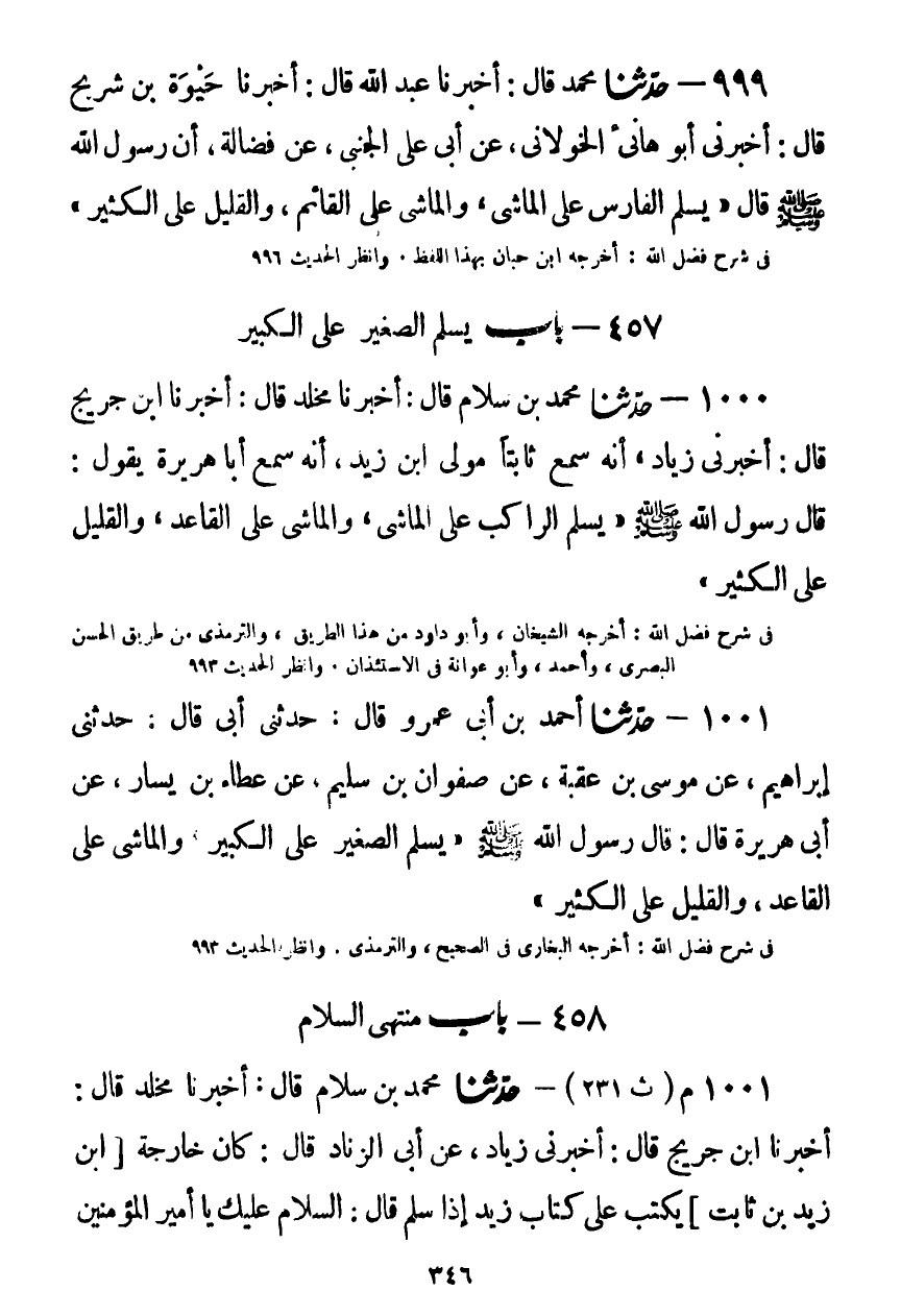 1000 - حَدَّثَنَا مُحَمَّدُ بْنُ سَلَّامٍ قَالَ: أَخْبَرَنَا مَخْلَدٌ قَالَ: أَخْبَرَنَا ابْنُ جُرَيْجٍ قَالَ: أَخْبَرَنِي زِيَادٌ، أَنَّهُ سَمِعَ ثَابِتًا مَوْلَى ابْنِ زَيْدٍ، أَنَّهُ سَمِعَ أَبَا هُرَيْرَةَ يَقُولُ: قَالَ رَسُولُ اللَّهِ صَلَّى اللهُ عَلَيْهِ وَسَلَّمَ: «§يُسَلِّمُ الرَّاكِبُ عَلَى الْمَاشِي، وَالْمَاشِي عَلَى الْقَاعِدِ، وَالْقَلِيلُ عَلَى الْكَثِيرِ» Kصحيح