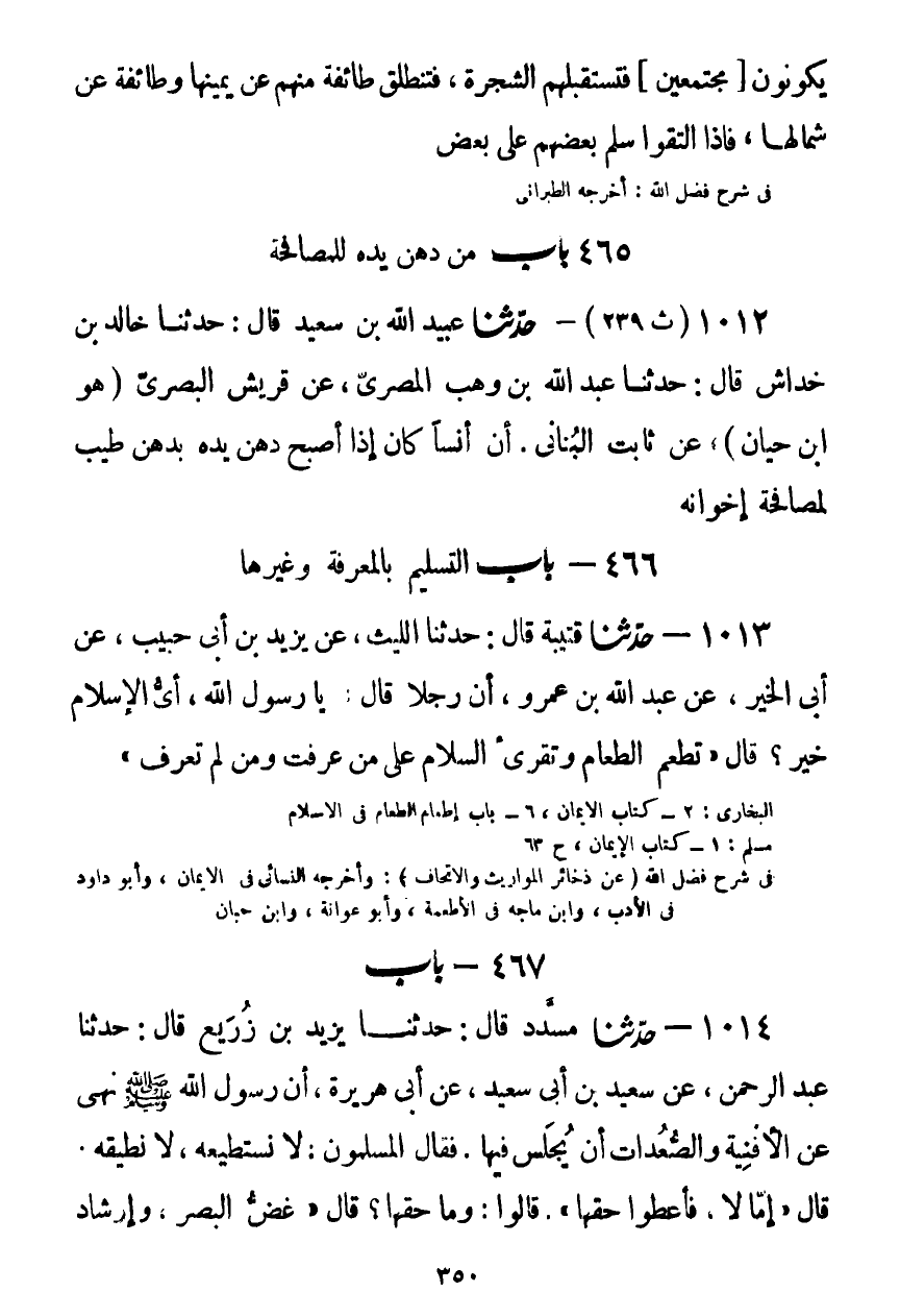 1012 - حَدَّثَنَا عُبَيْدُ اللَّهِ بْنُ سَعِيدٍ قَالَ: حَدَّثَنَا خَالِدُ بْنُ خِدَاشٍ قَالَ: حَدَّثَنَا عَبْدُ اللَّهِ بْنُ وَهْبٍ الْمِصْرِيُّ، عَنْ قُرَيْشٍ الْبَصْرِيِّ هُوَ ابْنُ حَيَّانَ، عَنْ ثَابِتٍ الْبُنَانِيِّ، أَنَّ أَنَسًا كَانَ §إِذَا أَصْبَحَ ادَّهَنَ يَدَهُ بِدُهْنٍ طَيِّبٍ لِمُصَافَحَةِ إِخْوَانِهِKصحيح
