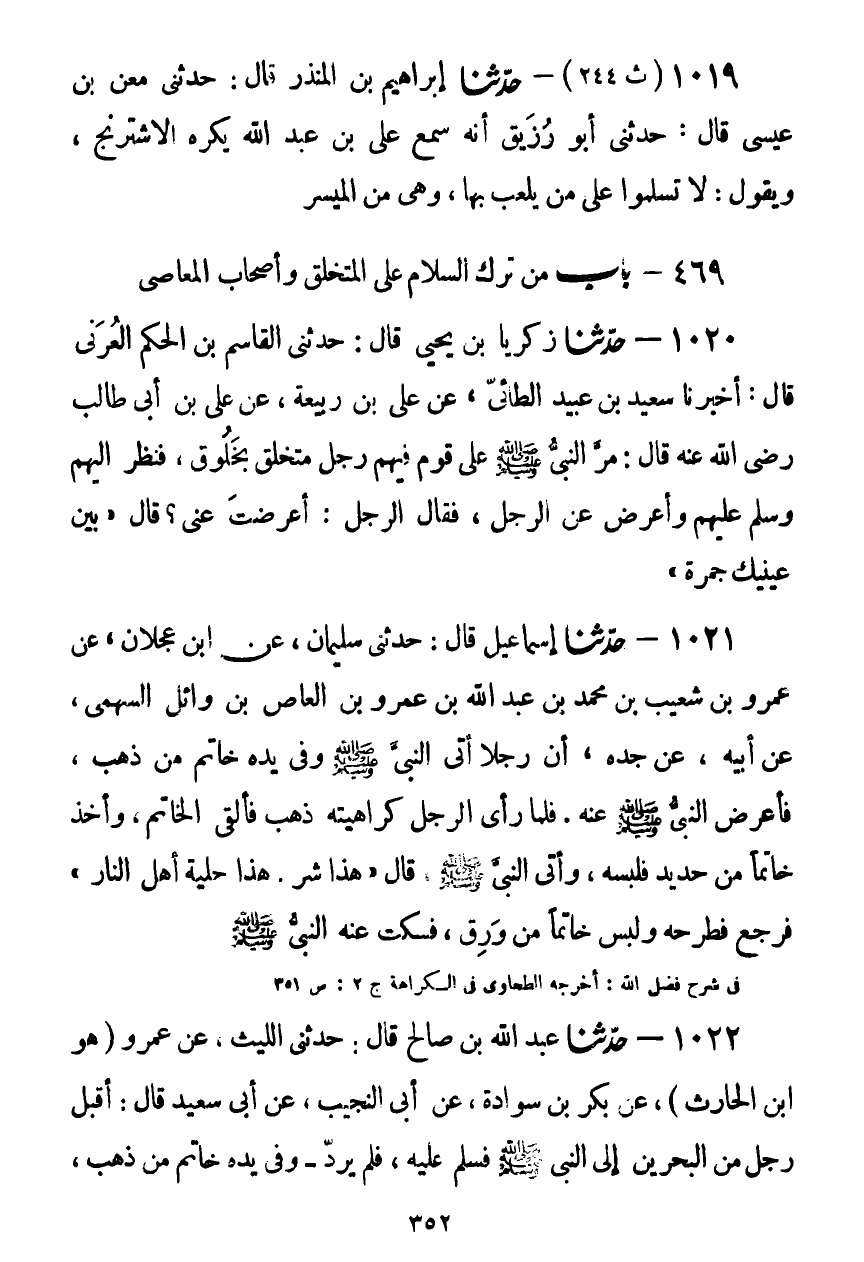 1020 - حَدَّثَنَا زَكَرِيَّا بْنُ يَحْيَى قَالَ: حَدَّثَنِي الْقَاسِمُ بْنُ الْحَكَمِ الْعُرَنِيُّ قَالَ: أَخْبَرَنَا سَعِيدُ بْنُ عُبَيْدٍ الطَّائِيُّ، عَنْ عَلِيِّ بْنِ رَبِيعَةَ، عَنْ عَلِيِّ بْنِ أَبِي طَالِبٍ رَضِيَ اللَّهُ عَنْهُ قَالَ: مَرَّ النَّبِيُّ صَلَّى اللهُ عَلَيْهِ وَسَلَّمَ عَلَى قَوْمٍ فِيهِمْ رَجُلٌ مُتَخَلِّقٌ بِخَلُوقٍ، فَنَظَرَ إِلَيْهِمْ §وَسَلَّمَ عَلَيْهِمْ، وَأَعْرَضَ عَنِ الرَّجُلِ، فَقَالَ الرَّجُلُ: أَعْرَضْتَ عَنِّي؟ قَالَ: «بَيْنَ عَيْنَيْهِ جَمْرَةٌ» Kحسن