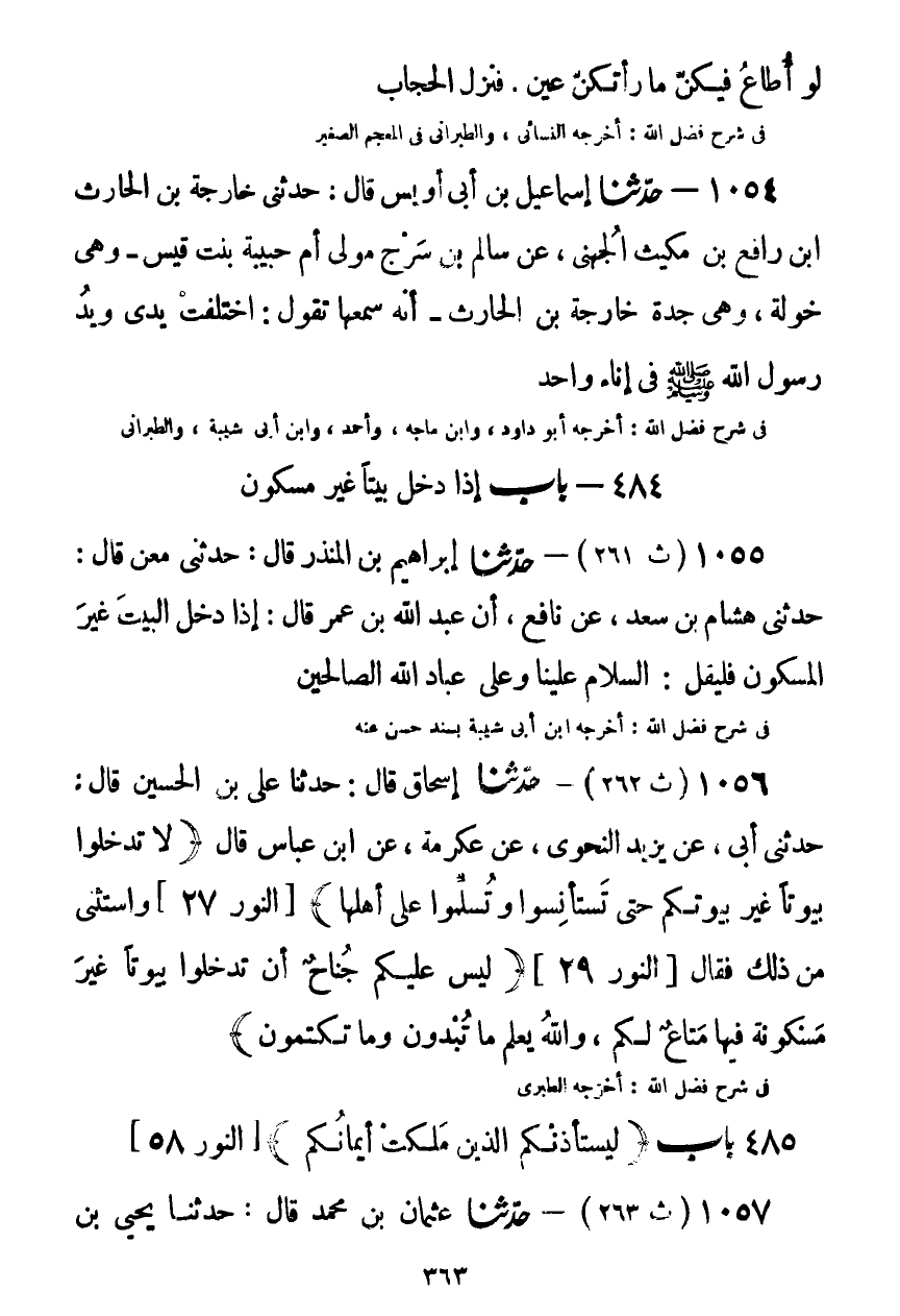 1056 - حَدَّثَنَا إِسْحَاقُ قَالَ: حَدَّثَنَا عَلِيُّ بْنُ الْحُسَيْنِ قَالَ: حَدَّثَنِي أَبِي، عَنْ يَزِيدَ النَّحْوِيِّ، عَنْ عِكْرِمَةَ، عَنِ ابْنِ عَبَّاسٍ قَالَ: {§لَا تَدْخُلُوا بُيُوتًا غَيْرَ بُيُوتِكُمْ حَتَّى تَسْتَأْنِسُوا وَتُسَلِّمُوا عَلَى أَهْلِهَا} [النور: 27] ، وَاسْتَثْنَى مِنْ ذَلِكَ، فَقَالَ: {لَيْسَ عَلَيْكُمْ جُنَاحٌ أَنْ تَدْخُلُوا بُيُوتًا غَيْرَ مَسْكُونَةٍ فِيهَا مَتَاعٌ لَكُمْ} [النور: 29] إِلَى قَوْلِهِ: {تَكْتُمُونَ} [النور: 29] Kصحيح