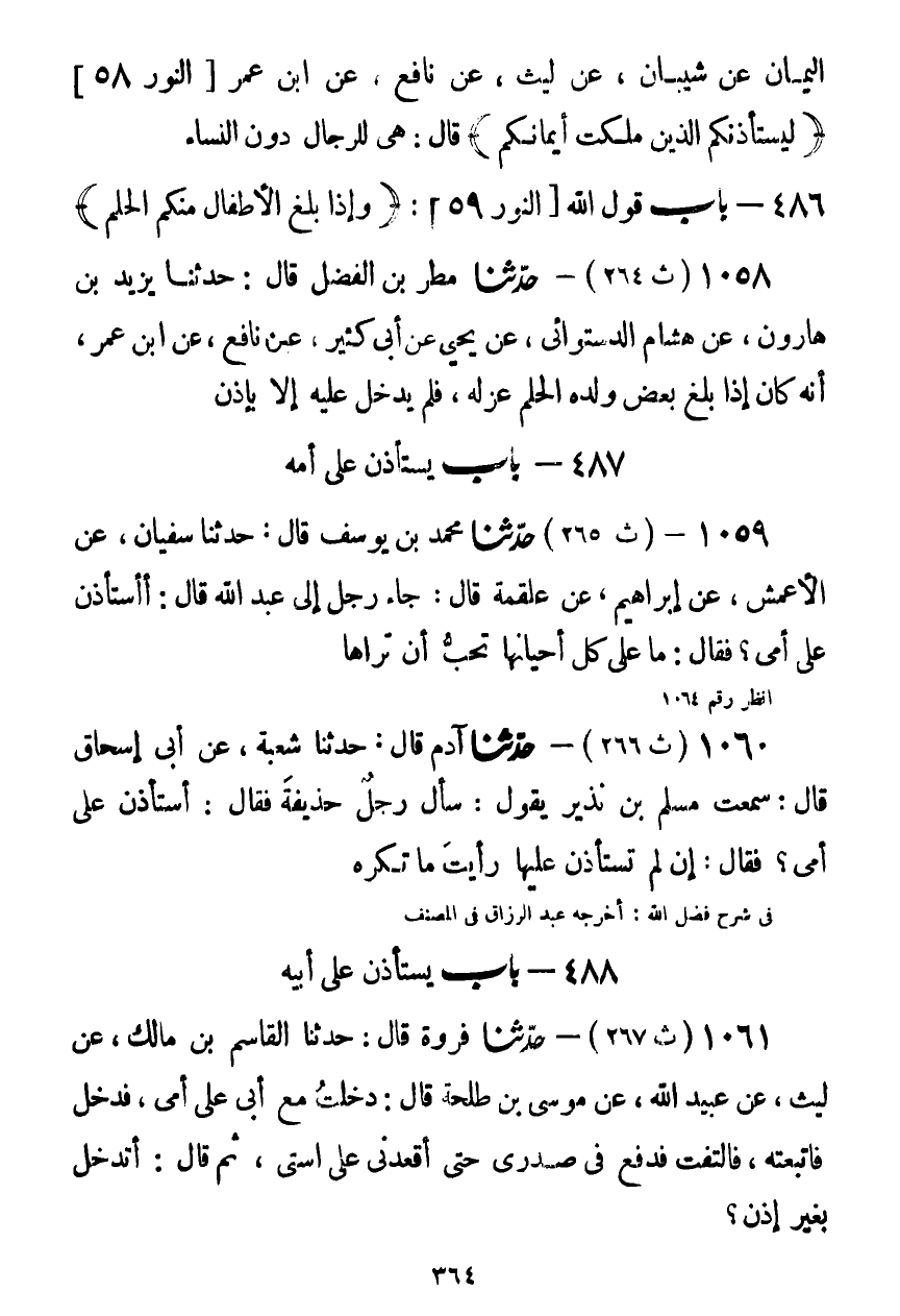1058 - حَدَّثَنَا مَطَرُ بْنُ الْفَضْلِ قَالَ: حَدَّثَنَا يَزِيدُ بْنُ هَارُونَ، عَنْ هِشَامٍ الدَّسْتُوَائِيِّ، عَنْ يَحْيَى بْنِ أَبِي كَثِيرٍ، عَنْ نَافِعٍ، عَنِ ابْنِ عُمَرَ، §أَنَّهُ كَانَ إِذَا بَلَغَ بَعْضُ وَلَدِهِ الْحُلُمَ عَزَلَهُ، فَلَمْ يَدْخُلْ عَلَيْهِ إِلَّا بِإِذْنٍKصحيح