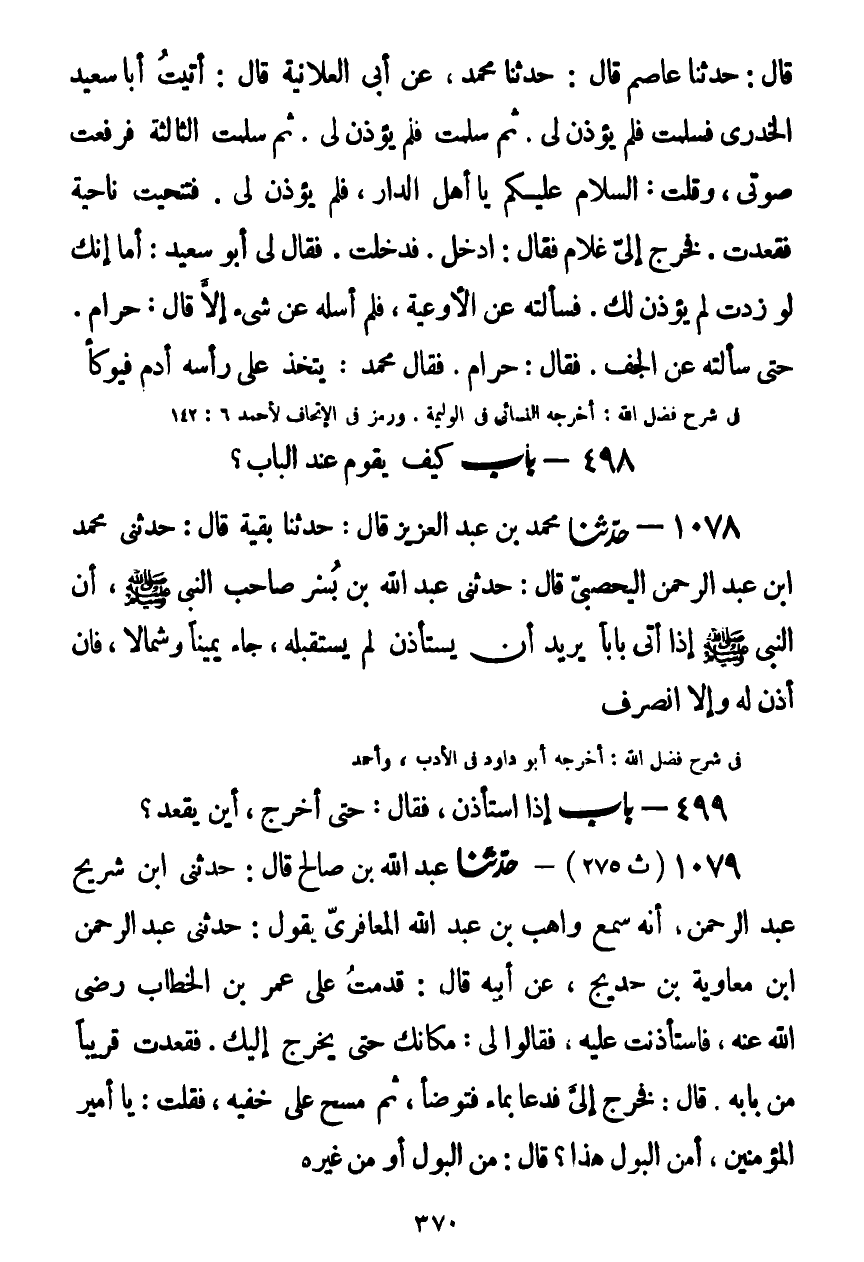 1078 - حَدَّثَنَا مُحَمَّدُ بْنُ عَبْدِ الْعَزِيزِ قَالَ: حَدَّثَنَا بَقِيَّةُ قَالَ: حَدَّثَنِي مُحَمَّدُ بْنُ عَبْدِ الرَّحْمَنِ الْيَحْصِبِيُّ قَالَ: حَدَّثَنِي عَبْدُ اللَّهِ بْنُ بُسْرٍ، صَاحِبُ النَّبِيِّ صَلَّى اللهُ عَلَيْهِ وَسَلَّمَ، أَنَّ النَّبِيَّ صَلَّى اللهُ عَلَيْهِ وَسَلَّمَ كَانَ §إِذَا أَتَى بَابًا يُرِيدُ أَنْ يَسْتَأْذِنَ لَمْ يَسْتَقْبِلْهُ، جَاءَ يَمِينًا وَشِمَالًا، فَإِنْ أُذِنَ لَهُ وَإِلَّا انْصَرَفَKحسن صحيح