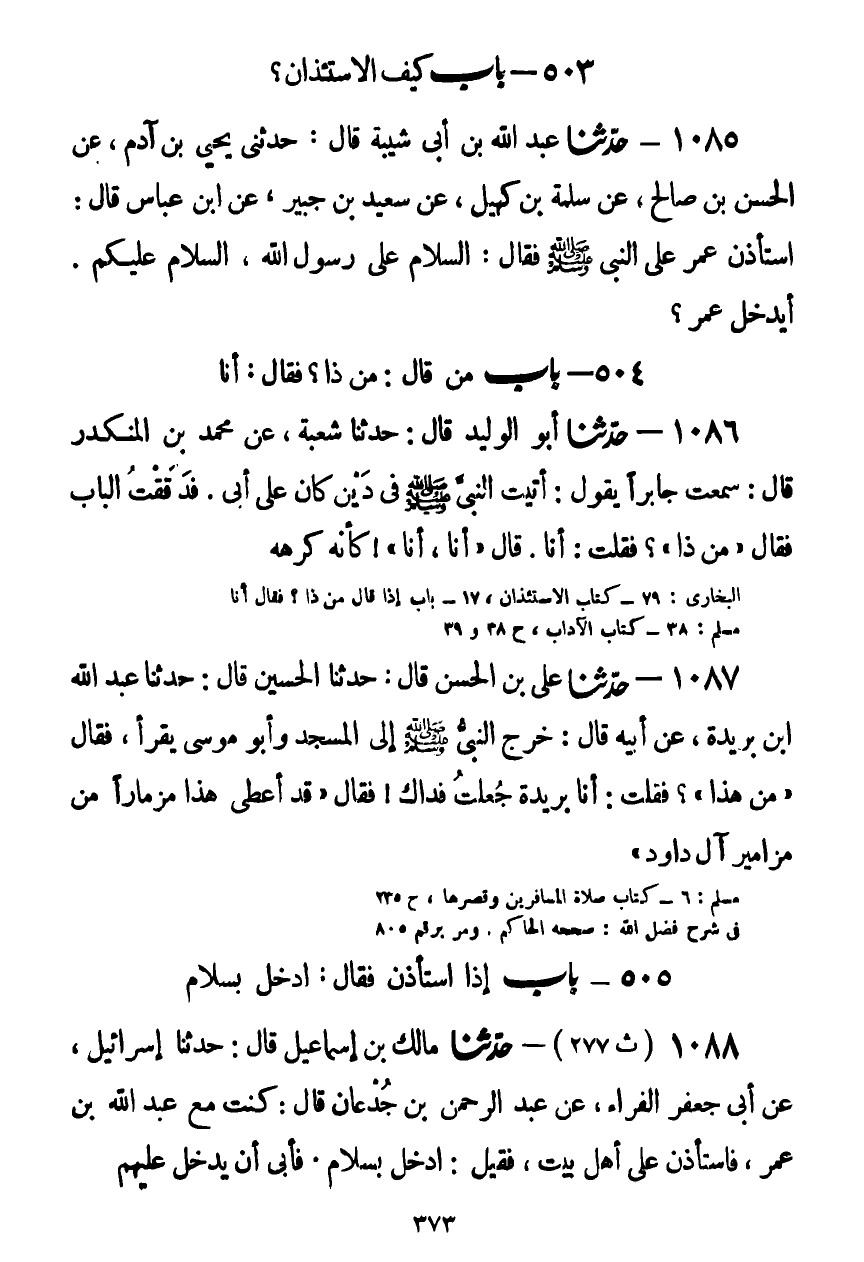 1085 - حَدَّثَنَا عَبْدُ اللَّهِ بْنُ أَبِي شَيْبَةَ قَالَ: حَدَّثَنِي يَحْيَى بْنُ آدَمَ، عَنِ الْحَسَنِ بْنِ صَالِحٍ، عَنْ سَلَمَةَ بْنِ كُهَيْلٍ، عَنْ سَعِيدِ بْنِ جُبَيْرٍ، عَنِ ابْنِ عَبَّاسٍ قَالَ: اسْتَأْذَنَ عُمَرُ عَلَى النَّبِيِّ صَلَّى اللهُ عَلَيْهِ وَسَلَّمَ فَقَالَ: §السَّلَامُ عَلَى رَسُولِ اللَّهِ، السَّلَامُ عَلَيْكُمْ، أَيَدْخُلُ عُمَرُ؟ Kصحيح