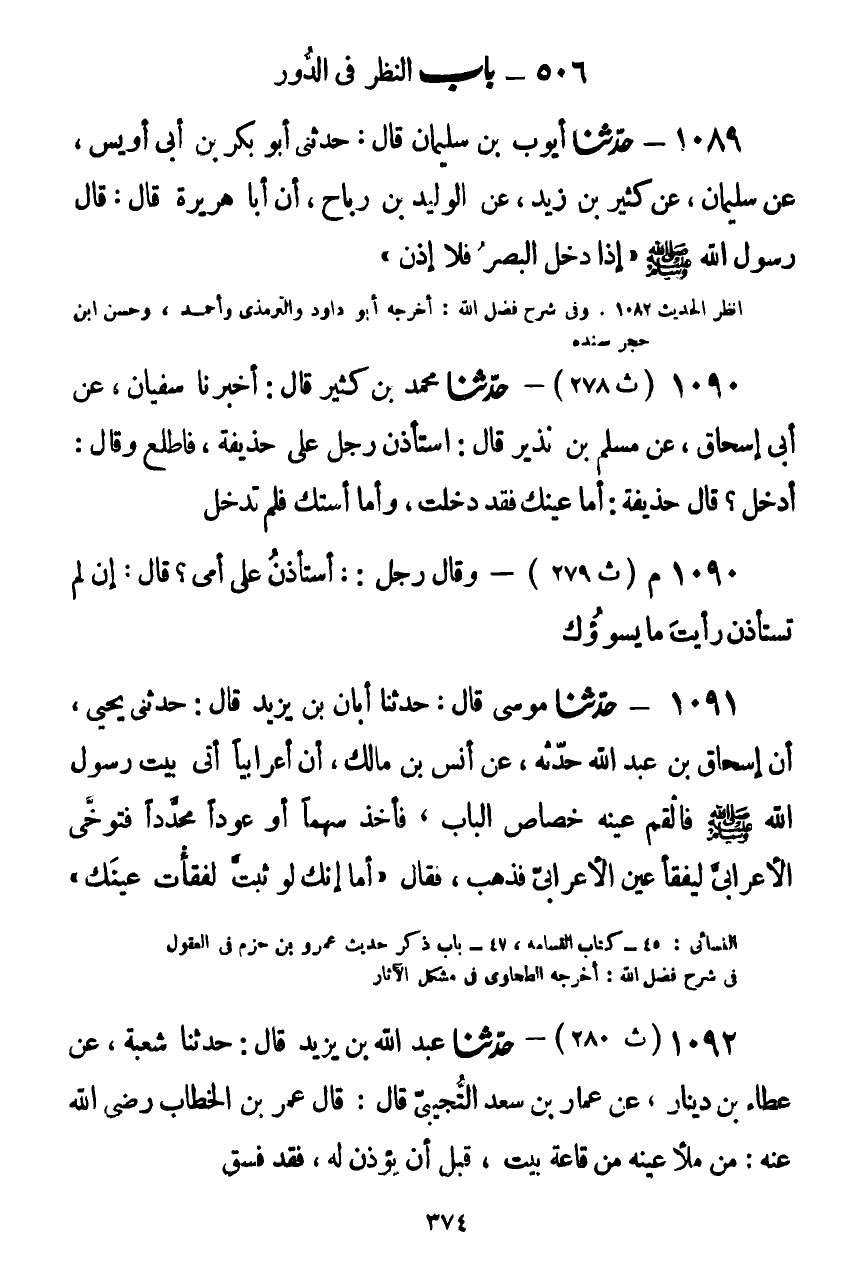 1092 - حَدَّثَنَا عَبْدُ اللَّهِ بْنُ يَزِيدَ قَالَ: حَدَّثَنَا شُعْبَةُ، عَنْ عَطَاءِ بْنِ دِينَارٍ، عَنْ عَمَّارِ بْنِ سَعْدٍ التُّجِيبِيِّ قَالَ: قَالَ عُمَرُ بْنُ الْخَطَّابِ رَضِيَ اللَّهُ عَنْهُ: §مَنْ مَلَأَ عَيْنَيْهِ مِنْ قَاعَةِ بَيْتٍ، قَبْلَ أَنْ يُؤْذَنَ لَهُ، فَقَدْ فَسَقَKضعيف الإسناد موقوفا
