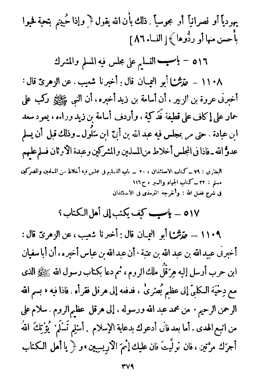 1109 - حَدَّثَنَا أَبُو الْيَمَانِ قَالَ: أَخْبَرَنَا شُعَيْبٌ، عَنِ الزُّهْرِيِّ قَالَ: أَخْبَرَنِي عُبَيْدُ اللَّهِ بْنُ عَبْدِ اللَّهِ بْنِ عُتْبَةَ، أَنَّ عَبْدَ اللَّهِ بْنَ عَبَّاسٍ أَخْبَرَهُ، أَنَّ أَبَا سُفْيَانَ بْنَ حَرْبٍ أَخْبَرَهُ: أَرْسَلَ إِلَيْهِ هِرَقْلُ مَلِكُ الرُّومِ، ثُمَّ دَعَا بِكِتَابِ رَسُولِ اللَّهِ صَلَّى اللهُ عَلَيْهِ وَسَلَّمَ الَّذِي أُرْسِلَ بِهِ مَعَ دِحْيَةَ الْكَلْبِيِّ إِلَى عَظِيمِ بُصْرَى، فَدَفَعَهُ إِلَيَّ هِرَقْلُ فَقَرَأَهُ، فَإِذَا فِيهِ: " بِسْمِ اللَّهِ الرَّحْمَنِ الرَّحِيمِ، مِنْ مُحَمَّدٍ عَبْدِ اللَّهِ وَرَسُولِهِ إِلَى هِرَقْلَ عَظِيمِ الرُّومِ، §سَلَّامٌ عَلَى مَنِ اتَّبَعَ الْهُدَى، أَمَّا بَعْدُ، فَإِنِّي أَدْعُوكَ بِدِعَايَةِ الْإِسْلَامِ، أَسْلِمْ تَسْلَمْ، يُؤْتِكَ اللَّهُ أَجْرَكَ مَرَّتَيْنِ، فَإِنْ تَوَلَّيْتَ فَإِنَّ عَلَيْكَ إِثْمَ الْأَرِيسِيِّينَ وَ {يَا أَهْلَ الْكِتَابِ تَعَالَوْا إِلَى كَلِمَةٍ سَوَاءٍ بَيْنَنَا وَبَيْنَكُمْ} [آل عمران: 64] إِلَى قَوْلِهِ: {اشْهَدُوا بِأَنَّا مُسْلِمُونَ} [آل عمران: 64] Kصحيح