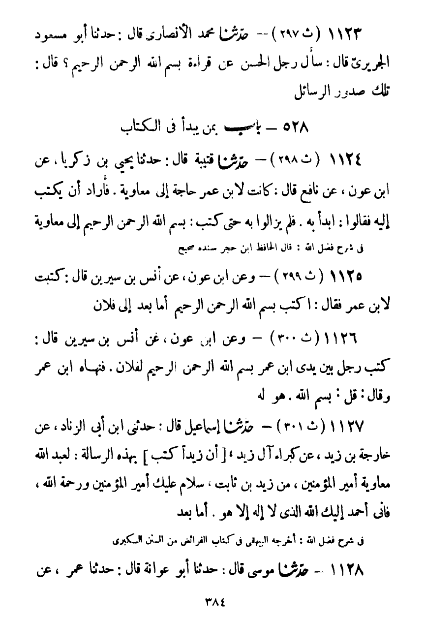 1124 - حَدَّثَنَا قُتَيْبَةُ قَالَ: حَدَّثَنَا يَحْيَى بْنُ زَكَرِيَّا، عَنِ ابْنِ عَوْنٍ، عَنْ نَافِعٍ قَالَ: كَانَتْ لِابْنِ عُمَرَ حَاجَةٌ إِلَى مُعَاوِيَةَ، فَأَرَادَ أَنْ يَكْتُبَ إِلَيْهِ، فَقَالُوا: ابْدَأْ بِهِ، فَلَمْ يَزَالُوا بِهِ حَتَّى كَتَبَ: §بِسْمِ اللَّهِ الرَّحْمَنِ الرَّحِيمِ، إِلَى مُعَاوِيَةَKصحيح