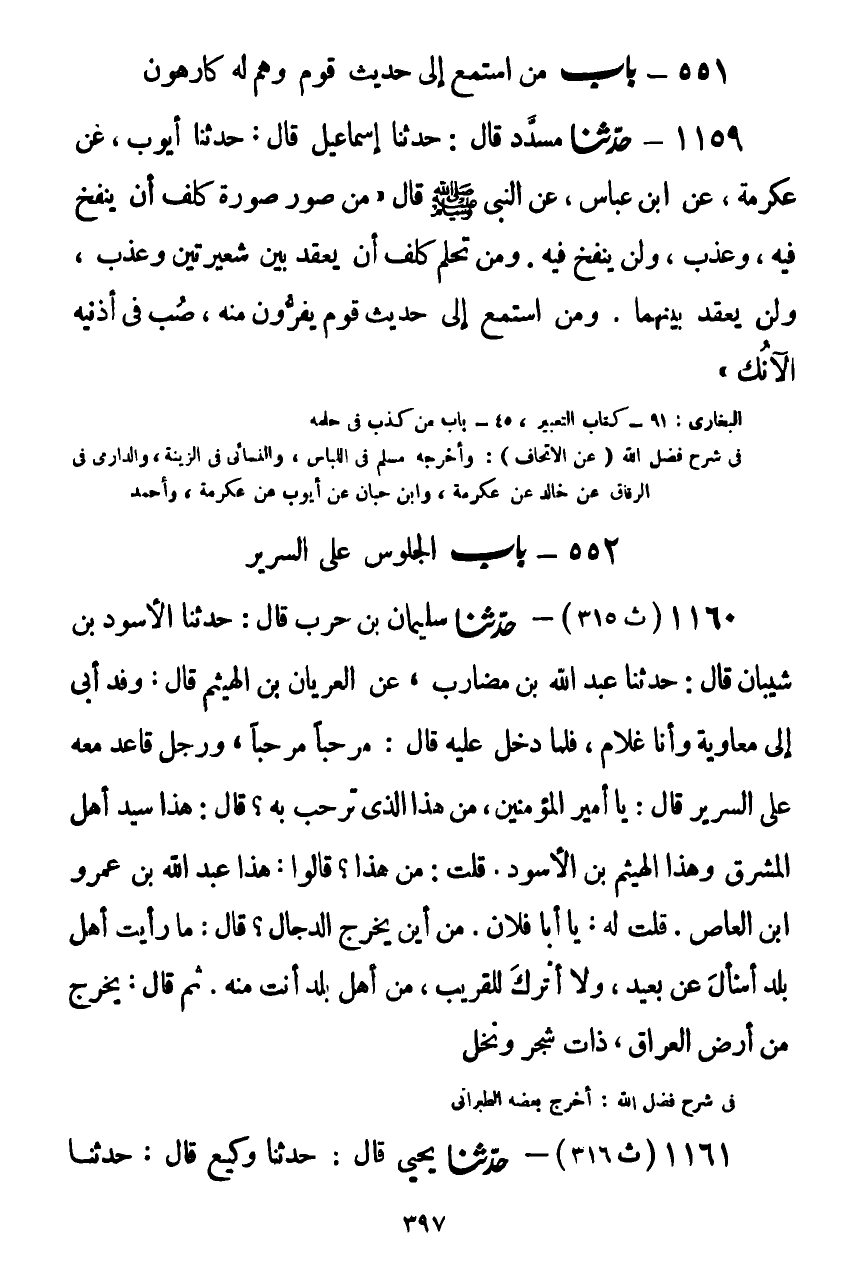 1159 - حَدَّثَنَا مُسَدَّدٌ قَالَ: حَدَّثَنَا إِسْمَاعِيلُ قَالَ: حَدَّثَنَا أَيُّوبُ، عَنْ عِكْرِمَةَ، عَنِ ابْنِ عَبَّاسٍ، عَنِ النَّبِيِّ صَلَّى اللهُ عَلَيْهِ وَسَلَّمَ قَالَ: «§مَنْ صَوَّرَ صُورَةً كُلِّفَ أَنْ يَنْفُخَ فِيهِ وَعُذِّبَ، وَلَنْ يَنْفُخَ فِيهِ. وَمَنْ تَحَلَّمَ كُلِّفَ أَنْ يَعْقِدَ بَيْنَ شَعِيرَتَيْنِ وَعُذِّبَ، وَلَنْ يَعْقِدَ بَيْنَهُمَا، وَمَنِ اسْتَمَعَ إِلَى حَدِيثِ قَوْمٍ يَفِرُّونَ مِنْهُ، صُبَّ فِي أُذُنَيْهِ الْآنُكُ» Kصحيح