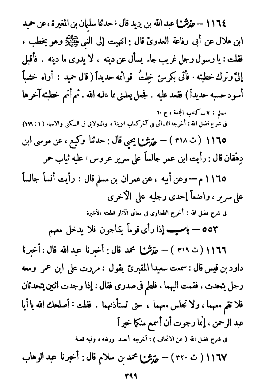 1164 - حَدَّثَنَا عَبْدُ اللَّهِ بْنُ يَزِيدَ قَالَ: حَدَّثَنَا سُلَيْمَانُ بْنُ الْمُغِيرَةِ، عَنْ حُمَيْدِ بْنِ هِلَالٍ، عَنْ أَبِي رِفَاعَةَ الْعَدَوِيِّ قَالَ: انْتَهَيْتُ إِلَى النَّبِيِّ صَلَّى اللهُ عَلَيْهِ وَسَلَّمَ وَهُوَ يَخْطُبُ، فَقُلْتُ: يَا رَسُولَ اللَّهِ، رَجُلٌ غَرِيبٌ جَاءَ يَسْأَلُ عَنْ دِينِهِ، لَا يَدْرِي مَا دِينُهُ، فَأَقْبَلَ إِلَيَّ وَتَرَكَ خُطْبَتَهُ، فَأَتَى بِكُرْسِيٍّ خِلْتُ قَوَائِمَهُ حَدِيدًا - قَالَ حُمَيْدٌ: أُرَاهُ خَشَبًا أَسْوَدَ حَسَبُهُ حَدِيدًا - فَقَعَدَ عَلَيْهِ، فَجَعَلَ §يُعَلِّمُنِي مِمَّا عَلَّمَهُ اللَّهُ، ثُمَّ أَتَمَّ خُطْبَتَهُ، آخِرَهَاKصحيح