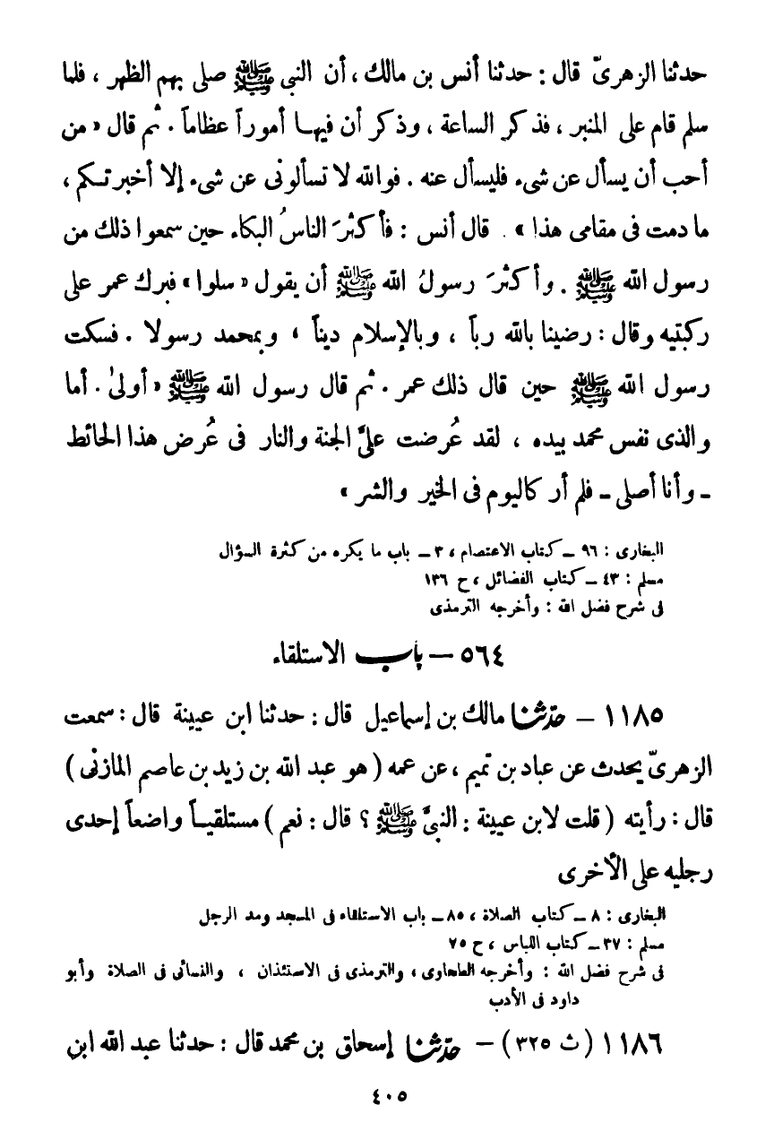 1185 - حَدَّثَنَا مَالِكُ بْنُ إِسْمَاعِيلَ قَالَ: حَدَّثَنَا ابْنُ عُيَيْنَةَ قَالَ: سَمِعْتُ الزُّهْرِيَّ يُحَدِّثُهُ، عَنْ عَبَّادِ بْنِ تَمِيمٍ، عَنْ عَمِّهِ قَالَ: رَأَيْتُهُ - قُلْتُ لِابْنِ عُيَيْنَةَ: النَّبِيُّ صَلَّى اللهُ عَلَيْهِ وَسَلَّمَ؟ قَالَ: نَعَمْ §مُسْتَلْقِيًا، وَاضِعًا إِحْدَى رِجْلَيْهِ عَلَى الْأُخْرَىKصحيح