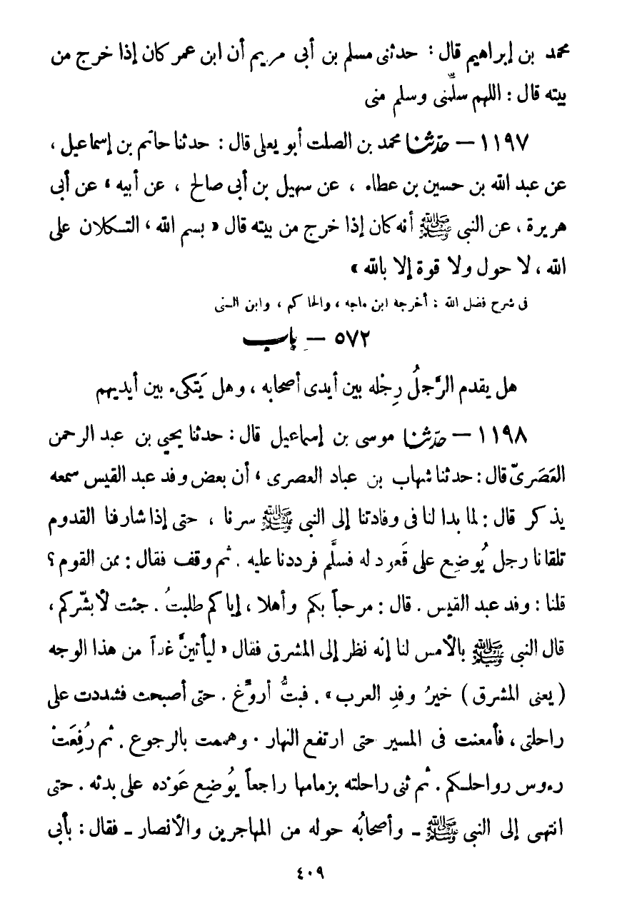 1197 - حَدَّثَنَا مُحَمَّدُ بْنُ الصَّلْتِ أَبُو يَعْلَى قَالَ: حَدَّثَنَا حَاتِمُ بْنُ إِسْمَاعِيلَ، عَنْ عَبْدِ اللَّهِ بْنِ حُسَيْنِ بْنِ عَطَاءٍ، عَنْ سُهَيْلِ بْنِ أَبِي صَالِحٍ، عَنْ أَبِيهِ، عَنْ أَبِي هُرَيْرَةَ، عَنِ النَّبِيِّ صَلَّى اللهُ عَلَيْهِ وَسَلَّمَ أَنَّهُ كَانَ إِذَا خَرَجَ مِنْ بَيْتِهِ قَالَ: «§بِسْمِ اللَّهِ، التُّكْلَانُ عَلَى اللَّهِ، لَا حَوْلَ وَلَا قُوَّةَ إِلَّا بِاللَّهِ» Kضعيف