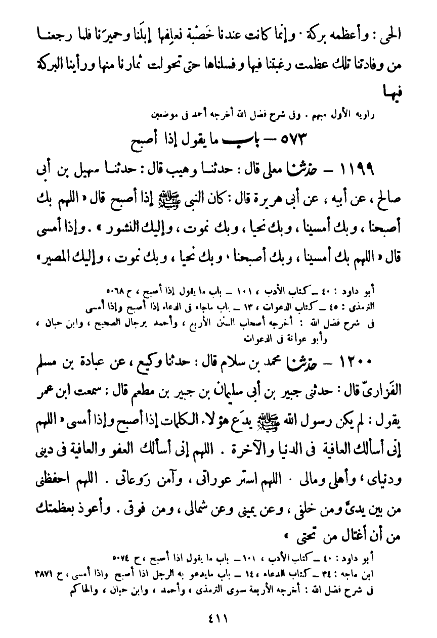 1200 - حَدَّثَنَا مُحَمَّدُ بْنُ سَلَّامٍ قَالَ: حَدَّثَنَا وَكِيعٌ، عَنْ عُبَادَةَ بْنِ مُسْلِمٍ الْفَزَارِيِّ قَالَ: حَدَّثَنِي جُبَيْرُ بْنُ أَبِي سُلَيْمَانَ بْنِ جُبَيْرِ بْنِ مُطْعِمٍ قَالَ: سَمِعْتُ ابْنَ عُمَرَ يَقُولُ: لَمْ يَكُنْ رَسُولُ اللَّهِ صَلَّى اللهُ عَلَيْهِ وَسَلَّمَ يَدَعُ هَؤُلَاءِ الْكَلِمَاتِ إِذَا أَصْبَحَ وَإِذَا أَمْسَى: «§اللَّهُمَّ إِنِّي أَسْأَلُكَ الْعَافِيَةَ فِي الدُّنْيَا وَالْآخِرَةِ. اللَّهُمَّ إِنِّي أَسْأَلُكَ الْعَفْوَ وَالْعَافِيَةَ فِي دِينِي وَدُنْيَايَ، وَأَهْلِي وَمَالِي. اللَّهُمَّ اسْتُرْ عَوْرَاتِي، وَآمِنْ رَوْعَاتِي. اللَّهُمَّ احْفَظْنِي مِنْ بَيْنِ يَدَيَّ وَمِنْ خَلْفِي، وَعَنْ يَمِينِي وَعَنْ شِمَالِي، وَمِنْ فَوْقِي، وَأَعُوذُ بِعَظَمَتِكَ مِنْ أَنْ أُغْتَالَ مِنْ تَحْتِي» Kصحيح