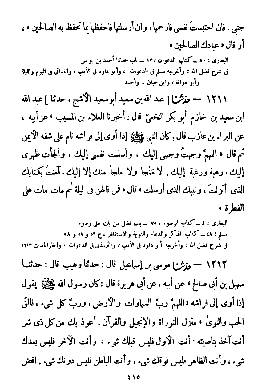 1211 - حَدَّثَنَا أَبُو سَعِيدٍ الْأَشَجُّ عَبْدُ اللَّهِ بْنُ سَعِيدٍ قَالَ: حَدَّثَنَا عَبْدُ اللَّهِ بْنُ سَعِيدِ بْنِ خَازِمٍ أَبُو بَكْرٍ النَّخَعِيُّ قَالَ: أَخْبَرَنَا الْعَلَاءُ بْنُ الْمُسَيَّبِ، عَنْ أَبِيهِ، عَنِ الْبَرَاءِ بْنِ عَازِبٍ قَالَ: كَانَ النَّبِيُّ صَلَّى اللهُ عَلَيْهِ وَسَلَّمَ §إِذَا أَوَى إِلَى فِرَاشِهِ نَامَ عَلَى شِقِّهِ الْأَيْمَنِ، ثُمَّ قَالَ: اللَّهُمَّ وَجَّهْتُ وَجْهِي إِلَيْكَ، وَأَسْلَمْتُ نَفْسِي إِلَيْكَ، وَأَلْجَأْتُ ظَهْرِي إِلَيْكَ، رَهْبَةً وَرَغْبَةً إِلَيْكَ، لَا مَنْجَا وَلَا مَلْجَأَ مِنْكَ إِلَّا إِلَيْكَ، آمَنْتُ بِكِتَابِكَ الَّذِي أَنْزَلْتَ، وَنَبِيِّكَ الَّذِي أَرْسَلْتَ "، قَالَ: «فَمَنْ قَالَهُنَّ فِي لَيْلَةٍ ثُمَّ مَاتَ مَاتَ عَلَى الْفِطْرَةِ» Kصحيح