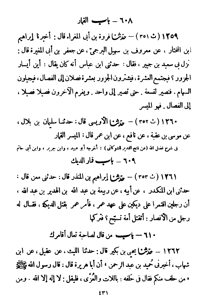 1260 - حَدَّثَنَا الْأُوَيْسِيُّ قَالَ: حَدَّثَنَا سُلَيْمَانُ بْنُ بِلَالٍ، عَنْ مُوسَى بْنِ عُقْبَةَ، عَنْ نَافِعٍ، عَنِ ابْنِ عُمَرَ قَالَ: §الْمَيْسِرُ: الْقِمَارُKصحيح الإسناد موقوفا