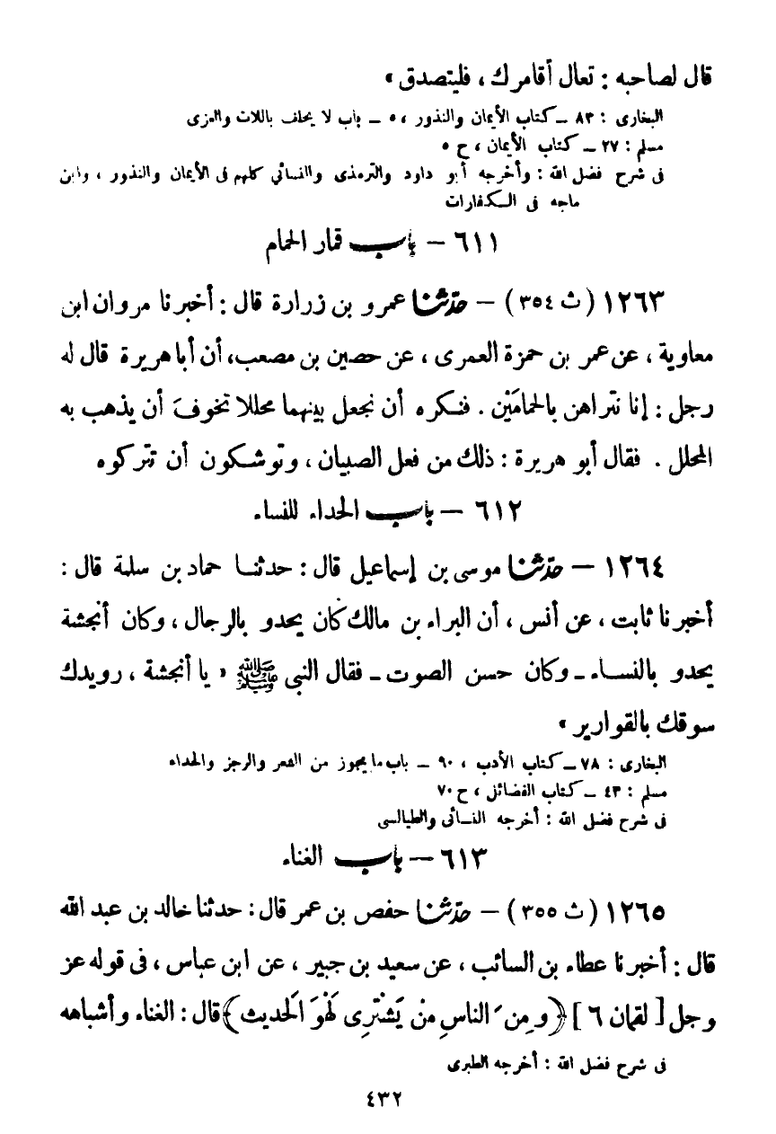 1264 - حَدَّثَنَا مُوسَى بْنُ إِسْمَاعِيلَ قَالَ: حَدَّثَنَا حَمَّادُ بْنُ سَلَمَةَ قَالَ: أَخْبَرَنَا ثَابِتٌ، عَنْ أَنَسٍ، أَنَّ الْبَرَاءَ بْنَ مَالِكٍ كَانَ يَحْدُو بِالرِّجَالِ، وَكَانَ أَنْجَشَةُ يَحْدُو بِالنِّسَاءِ، وَكَانَ حَسَنَ الصَّوْتِ، فَقَالَ النَّبِيُّ صَلَّى اللهُ عَلَيْهِ وَسَلَّمَ: «يَا أَنْجَشَةُ، §رُوَيْدَكَ سَوْقَكَ بِالْقَوَارِيرِ» Kصحيح