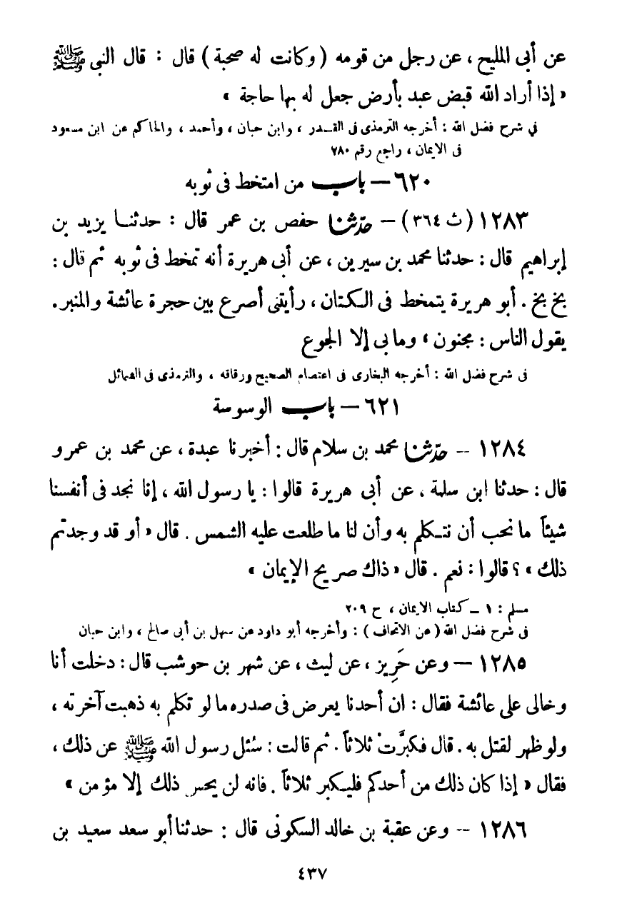 1284 - حَدَّثَنَا مُحَمَّدُ بْنُ سَلَّامٍ قَالَ: أَخْبَرَنَا عَبْدَةُ، عَنْ مُحَمَّدِ بْنِ عَمْرٍو قَالَ: حَدَّثَنَا أَبُو سَلَمَةَ، عَنْ أَبِي هُرَيْرَةَ: قَالُوا: يَا رَسُولَ اللَّهِ، إِنَّا نَجِدُ فِي أَنْفُسِنَا شَيْئًا مَا نُحِبُّ أَنْ نَتَكَلَّمَ بِهِ وَإِنَّ لَنَا مَا طَلَعَتْ عَلَيْهِ الشَّمْسُ، قَالَ: «أَوَ قَدْ وَجَدْتُمْ ذَلِكَ؟» قَالُوا: نَعَمْ، قَالَ: «§ذَاكَ صَرِيحُ الْإِيمَانِ» Kصحيح