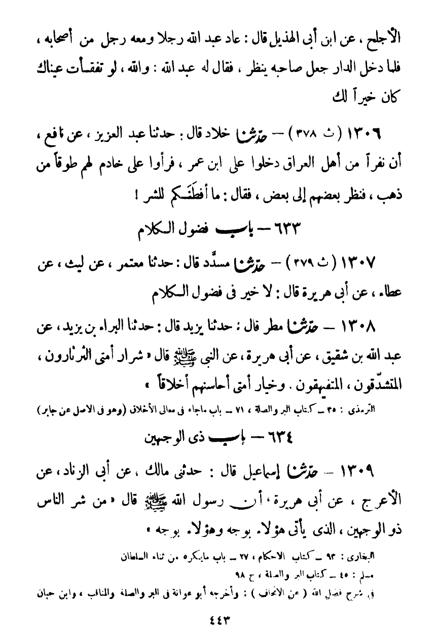 1309 - حَدَّثَنَا إِسْمَاعِيلُ قَالَ: حَدَّثَنِي مَالِكٌ، عَنْ أَبِي الزِّنَادِ، عَنِ الْأَعْرَجِ، عَنْ أَبِي هُرَيْرَةَ، أَنَّ رَسُولَ اللَّهِ صَلَّى اللهُ عَلَيْهِ وَسَلَّمَ قَالَ: «§مِنْ شَرِّ النَّاسِ ذُو الْوَجْهَيْنِ، الَّذِي يَأْتِي هَؤُلَاءِ بِوَجْهٍ، وَهَؤُلَاءِ بِوَجْهٍ» Kصحيح