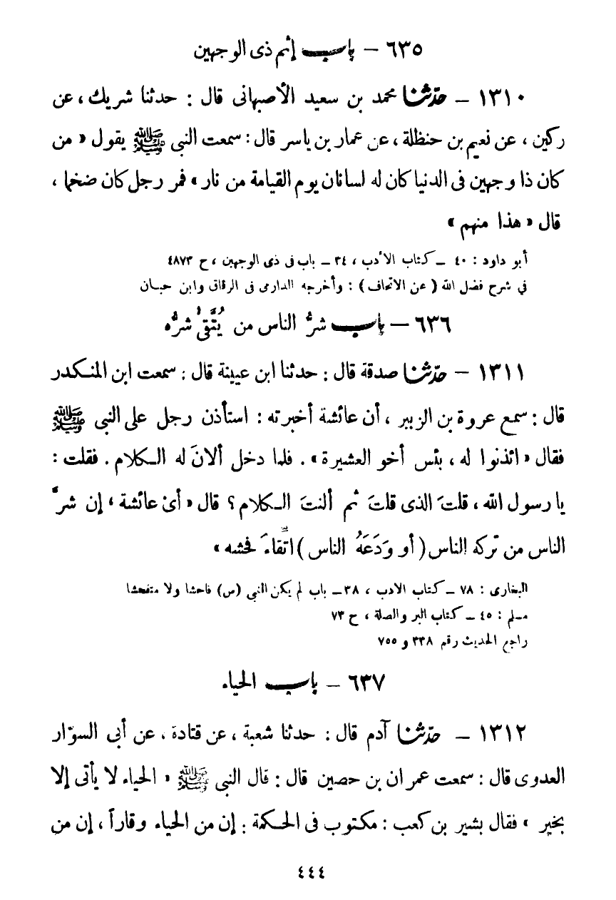 1311 - حَدَّثَنَا صَدَقَةُ قَالَ: حَدَّثَنَا ابْنُ عُيَيْنَةَ قَالَ: سَمِعْتُ ابْنَ الْمُنْكَدِرِ قَالَ: سَمِعَ عُرْوَةَ بْنَ الزُّبَيْرِ أَنَّ عَائِشَةَ أَخْبَرَتْهُ: اسْتَأْذَنَ رَجُلٌ عَلَى النَّبِيِّ صَلَّى اللهُ عَلَيْهِ وَسَلَّمَ فَقَالَ: «ائْذَنُوا لَهُ، بِئْسَ أَخُو الْعَشِيرَةِ» ، فَلَمَّا دَخَلَ أَلَانَ لَهُ الْكَلَامَ، فَقُلْتُ: يَا رَسُولَ اللَّهِ، قُلْتَ الَّذِي قُلْتَ، ثُمَّ أَلَنْتَ الْكَلَامَ، قَالَ: «أَيْ عَائِشَةُ، إِنَّ §شَرَّ النَّاسِ مَنْ تَرَكَهُ النَّاسُ - أَوْ وَدَعَهُ النَّاسُ - اتِّقَاءَ فُحْشِهِ» Kصحيح
