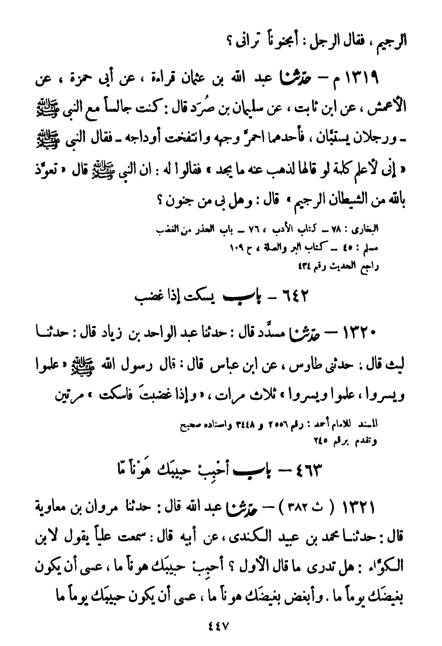 1319 - حَدَّثَنَا عَبْدُ اللَّهِ بْنُ عُثْمَانَ قِرَاءَةً، عَنْ أَبِي حَمْزَةَ، عَنِ الْأَعْمَشِ، عَنِ ابْنِ ثَابِتٍ، عَنْ سُلَيْمَانَ بْنِ صُرَدٍ قَالَ: كُنْتُ جَالِسًا مَعَ النَّبِيِّ صَلَّى اللهُ عَلَيْهِ وَسَلَّمَ وَرَجُلَانِ يَسْتَبَّانِ، فَأَحَدُهُمَا احْمَرَّ وَجْهُهُ، وَانْتَفَخَتْ أَوْدَاجُهُ، فَقَالَ النَّبِيُّ صَلَّى اللهُ عَلَيْهِ وَسَلَّمَ: «إِنِّي لَأَعْلَمُ كَلِمَةً لَوْ قَالَهَا لَذَهَبَ عَنْهُ مَا يَجِدُ» ، فَقَالُوا لَهُ: إِنَّ النَّبِيَّ صَلَّى اللهُ عَلَيْهِ وَسَلَّمَ قَالَ: «§تَعَوَّذْ بِاللَّهِ مِنَ الشَّيْطَانِ الرَّجِيمِ» ، قَالَ: وَهَلْ بِي مِنْ جُنُونٍ؟ Kصحيح