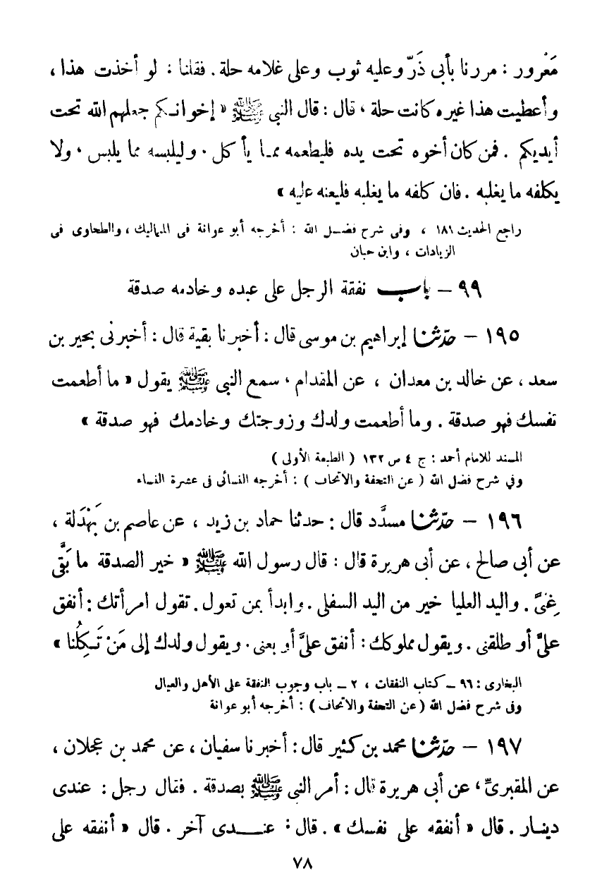 195 - حَدَّثَنَا إِبْرَاهِيمُ بْنُ مُوسَى قَالَ: أَخْبَرَنَا بَقِيَّةُ قَالَ: أَخْبَرَنِي بَحِيرُ بْنُ سَعْدٍ، عَنْ خَالِدِ بْنِ مَعْدَانَ، عَنِ الْمِقْدَامِ، سَمِعَ النَّبِيَّ صَلَّى اللهُ عَلَيْهِ وَسَلَّمَ يَقُولُ: «§مَا أَطْعَمْتَ نَفْسَكَ فَهُوَ صَدَقَةٌ، وَمَا أَطْعَمْتَ وَلَدَكَ وَزَوْجَتَكَ وَخَادِمَكَ فَهُوَ صَدَقَةٌ» Kصحيح
