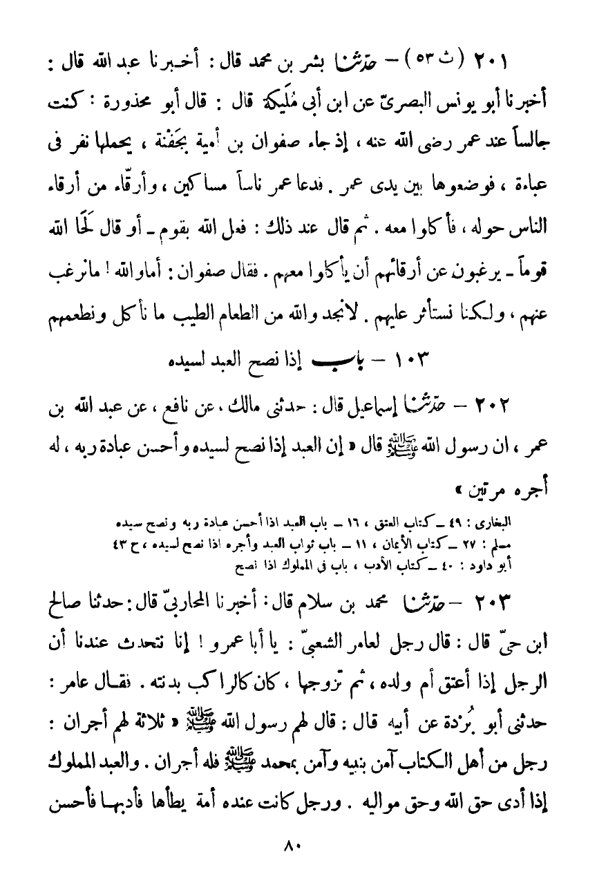 203 - حَدَّثَنَا مُحَمَّدُ بْنُ سَلَّامٍ قَالَ: أَخْبَرَنَا الْمُحَارِبِيُّ قَالَ: حَدَّثَنَا صَالِحُ بْنُ حَيٍّ قَالَ: قَالَ رَجُلٌ لِعَامِرٍ الشَّعْبِيِّ: يَا أَبَا عَمْرٍو، إِنَّا نَتَحَدَّثُ عِنْدَنَا أَنَّ الرَّجُلَ إِذَا أَعْتَقَ أُمَّ وَلَدِهِ ثُمَّ تَزَوَّجَهَا كَانَ كَالرَّاكِبِ بَدَنَتَهُ، فَقَالَ عَامِرٌ: حَدَّثَنِي أَبُو بُرْدَةَ، عَنْ أَبِيهِ قَالَ: قَالَ لَهُمْ رَسُولُ اللَّهِ صَلَّى اللهُ عَلَيْهِ وَسَلَّمَ: " §ثَلَاثَةٌ لَهُمْ أَجْرَانِ: رَجُلٌ مِنْ أَهْلِ الْكِتَابِ آمَنَ بِنَبِيِّهِ، وَآمَنَ بِمُحَمَّدٍ صَلَّى اللهُ عَلَيْهِ وَسَلَّمَ فَلَهُ أَجْرَانِ. وَالْعَبْدُ الْمَمْلُوكُ إِذَا أَدَّى حَقَّ اللَّهِ وَحَقَّ مَوَالِيهِ. وَرَجُلٌ كَانَتْ عِنْدَهُ أَمَةٌ يَطَأهَا، فَأَدَّبَهَا فَأَحْسَنَ تَأْدِيبَهَا، وَعَلَّمَهَا فَأَحْسَنَ تَعْلِيمَهَا، ثُمَّ أَعْتَقَهَا فَتَزَوَّجَهَا، فَلَهُ أَجْرَانِ " قَالَ عَامِرٌ: أَعْطَيْنَاكَهَا بِغَيْرِ شَيْءٍ، وَقَدْ كَانَ يَرْكَبُ فِيمَا دُونَهَا إِلَى الْمَدِينَةِ.Kصحيح