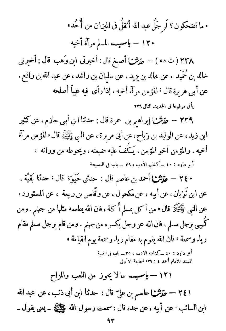 239 - حَدَّثَنَا إِبْرَاهِيمُ بْنُ حَمْزَةَ قَالَ: حَدَّثَنَا ابْنُ أَبِي حَازِمٍ، عَنْ كَثِيرِ بْنِ زَيْدٍ، عَنِ الْوَلِيدِ بْنِ رَبَاحٍ، عَنْ أَبِي هُرَيْرَةَ، عَنِ النَّبِيِّ صَلَّى اللهُ عَلَيْهِ وَسَلَّمَ قَالَ: " §الْمُؤْمِنُ مَرْآةُ أَخِيهِ، وَالْمُؤْمِنُ أَخُو الْمُؤْمِنِ، يَكُفُّ عَلَيْهِ ضَيْعَتَهُ، وَيَحُوطُهُ مِنْ وَرَائِهِKحسن