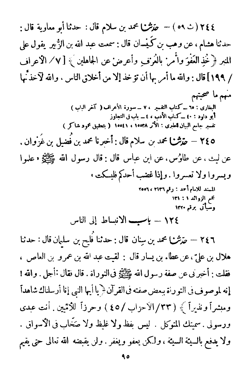 244 - حَدَّثَنَا مُحَمَّدُ بْنُ سَلَّامٍ قَالَ: حَدَّثَنَا أَبُو مُعَاوِيَةَ قَالَ: حَدَّثَنَا هِشَامٌ، عَنْ وَهْبِ بْنِ كَيْسَانَ قَالَ: سَمِعْتُ عَبْدَ اللَّهِ بْنَ الزُّبَيْرِ يَقُولُ عَلَى الْمِنْبَرِ: {خُذِ الْعَفْوَ} [الأعراف: 199] وَأْمُرْ بِالْعُرْفِ وَأَعْرِضْ عَنِ الْجَاهِلِينَ، قَالَ: §وَاللَّهِ مَا أَمَرَ بِهَا أَنْ تُؤْخَذَ إِلَّا مِنْ أَخْلَاقِ النَّاسِ، وَاللَّهِ لَآخُذَنَّهَا مِنْهُمْ مَا صَحِبْتُهُمْKصحيح
