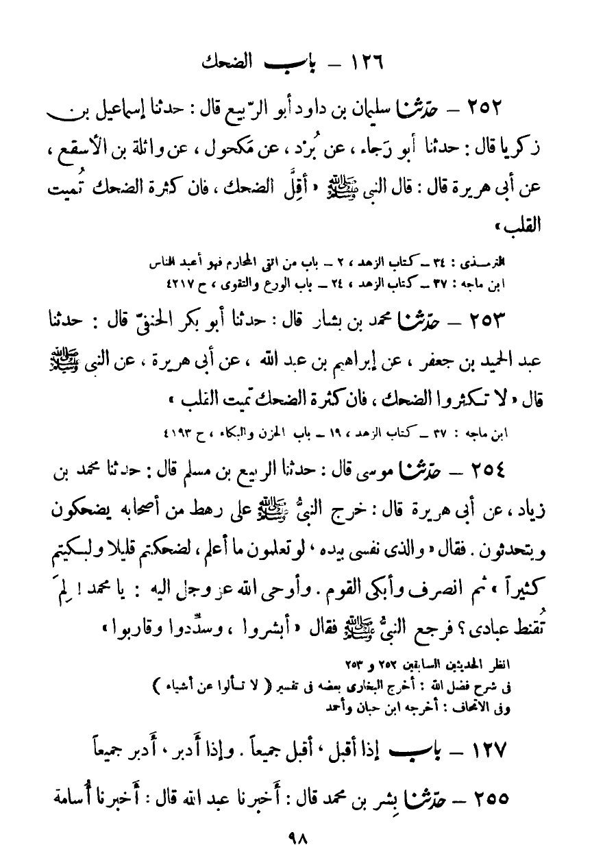 253 - حَدَّثَنَا مُحَمَّدُ بْنُ بَشَّارٍ قَالَ: حَدَّثَنَا أَبُو بَكْرٍ الْحَنَفِيُّ قَالَ: حَدَّثَنَا عَبْدُ الْحَمِيدِ بْنُ جَعْفَرٍ، عَنْ إِبْرَاهِيمَ بْنِ عَبْدِ اللَّهِ، عَنْ أَبِي هُرَيْرَةَ، عَنِ النَّبِيِّ صَلَّى اللهُ عَلَيْهِ وَسَلَّمَ قَالَ: «§لَا تُكْثِرُوا الضَّحِكَ، فَإِنَّ كَثْرَةَ الضَّحِكِ تُمِيتُ الْقَلْبَ» Kصحيح