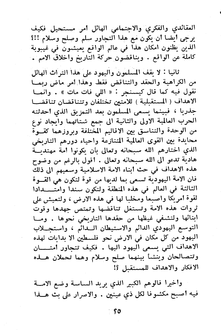 العقائدي والفكري والاجتماعي الهائل أمر مستحيل فكيف يرجى أيضاً أن يكون مع هذا التجاور سلم وصلح وسلام!!؟ الذين يظنون إمكان هذا في عالم الواقع يعيشون في غيبوبة كاملة عن الواقع، ويناقضون حركة التاريخ وأخلاق الأمم.