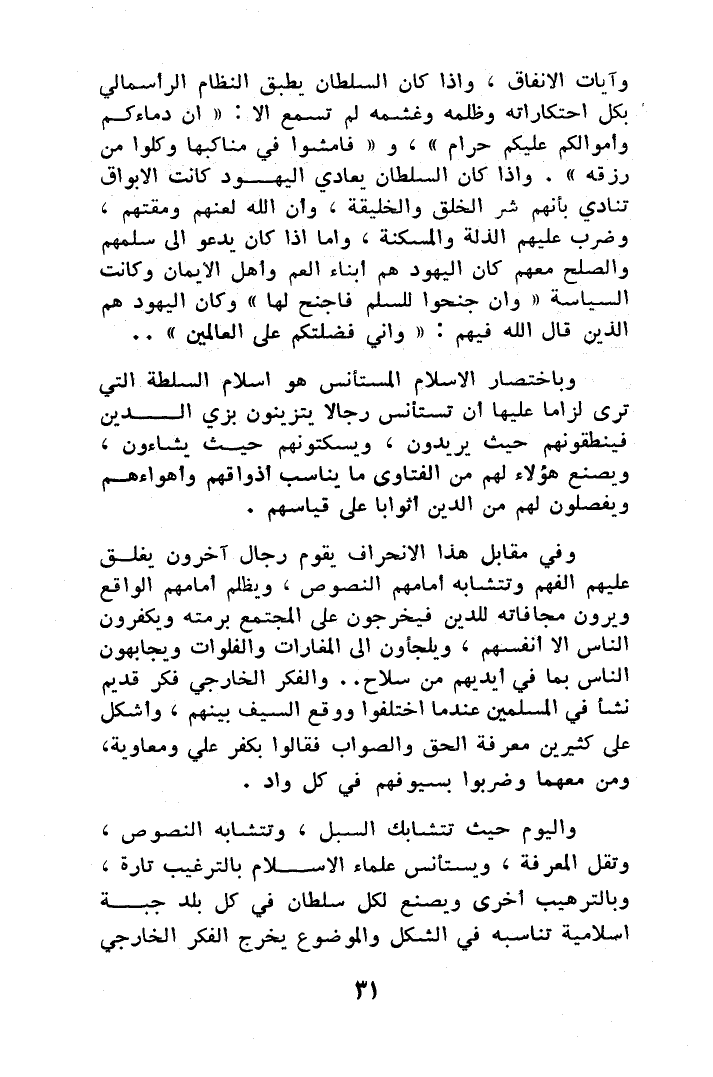 واليوم حيث تتشابك السبل، وتتشابه النصوص، وتقل المعرفة، ويستأنس علماء الإسلام بالترغيب تارة، وبالترهيب أخرى ويصنع لكل سلطان في كل بلد جبة إسلامية تناسبه في الشكل والموضوع يخرج الفكر الخارجي