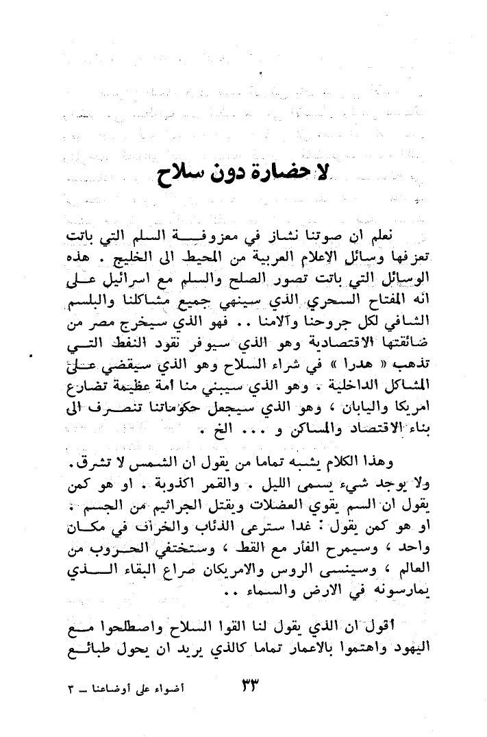 أقول إن الذي يقول لنا ألقوا السلاح واصطلحوا مع اليهود واهتموا بالاعمار تماماً كالذي يريد أن يحول طبائع
