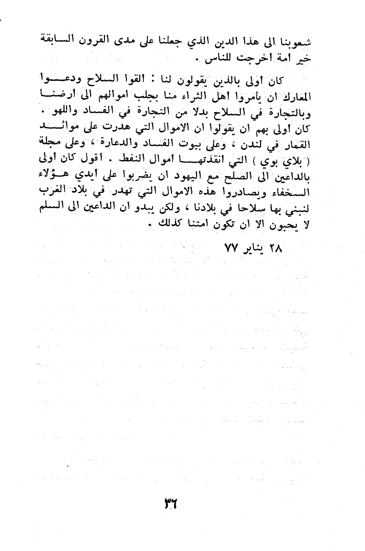 كان أولى بالذين يقولون لنا: ألقوا السلاح ودعوا المعارك أن يأمروا أهل الثراء منا بجلب أموالهم إلى أرضنا وبالتجارة في السلاح بدلاً من التجارة في الفساد واللهو، كما أولى بهم أن يقولوا إن الأموال التي هدرت على موائد القمار في لندن، وعلى بيوت الفساد والدعارة، وعلى مجلة (بلاي بوي) التي أنقذتها أموال النفط، أقول كان أولى بالداعين إلى الصلح مع اليهود أن يضربوا على أيدي هؤلاء السخفاء ويصادروا هذه الأموال التي تهدر في بلاد الغرب لنبني سلاحاً في بلادنا، ولكن يبدو أن الداعين إلى السلم لا يحبون إلا أن تكون أمتنا كذلك.