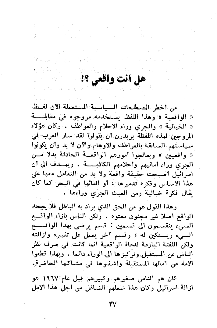 من أخطر المصطلحات السياسية المستعملة الآن لفظ "الواقعية" وهذا اللفظ يستخدمه مروجوه في مقابلة "الخيالية" والجري وراء الأحلام والعواطف، وكان هؤلاء المروجين لهذه اللفظة يريدون أن يقولوا لقد سار العرب في سياستهم السابقة بالعواطف والأوهام والآن لابد وأن يكونوا "واقعيين" ويعالجوا أمورهم الواقعة الحادثة بدلاً من الجري وراء أمانيهم وأحلامهم الكاذبة، ويهدف إلى أن إسرائيل أصبحت حقيقة واقعة ولا بد من التعامل معها على هذا الأساس وفكرة تدميرها، أو إلقائها في البحر كما كان يُقال فكرة خيالية ومن العبث الجري وراءها.