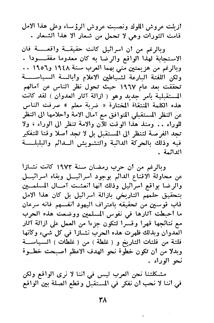 وبالرغم من أن إسرائيل كانت حقيقة واقعة فإن الاستجابة لهذا الواقع والرضا به كان معدوماً مفقوداً، وبالرغم من هزيمتين مني بهما العرب سنة 1948م و 1956م.. ولكن اللفتة البارعة لشياطين الإعلام وأبالسة السياسة تحققت بعد عام 1967م حيث تحول نظر الناس عن آمالهم المستقبلية بأمر جديد وهو (إزالة آثار العدوان) لقد كانت هذه الكلمة المنتقاة المختارة "ضرب معلم" صرفت الناس عن النظر المستقبلي المتوافق مع آمال الأمة وأحلامها إلى النظر للوراء.. ومنذ هذا الوقت للآن والأمة تنظر إلى الوراء، ولا نجد الفرصة لتنظر إلى المستقبل، بل لا تجد أصلاً وقتاً للتفكير فيه وذلك بالحركة الدائبة والتشويش الدائم والبلبلة الدائمة.