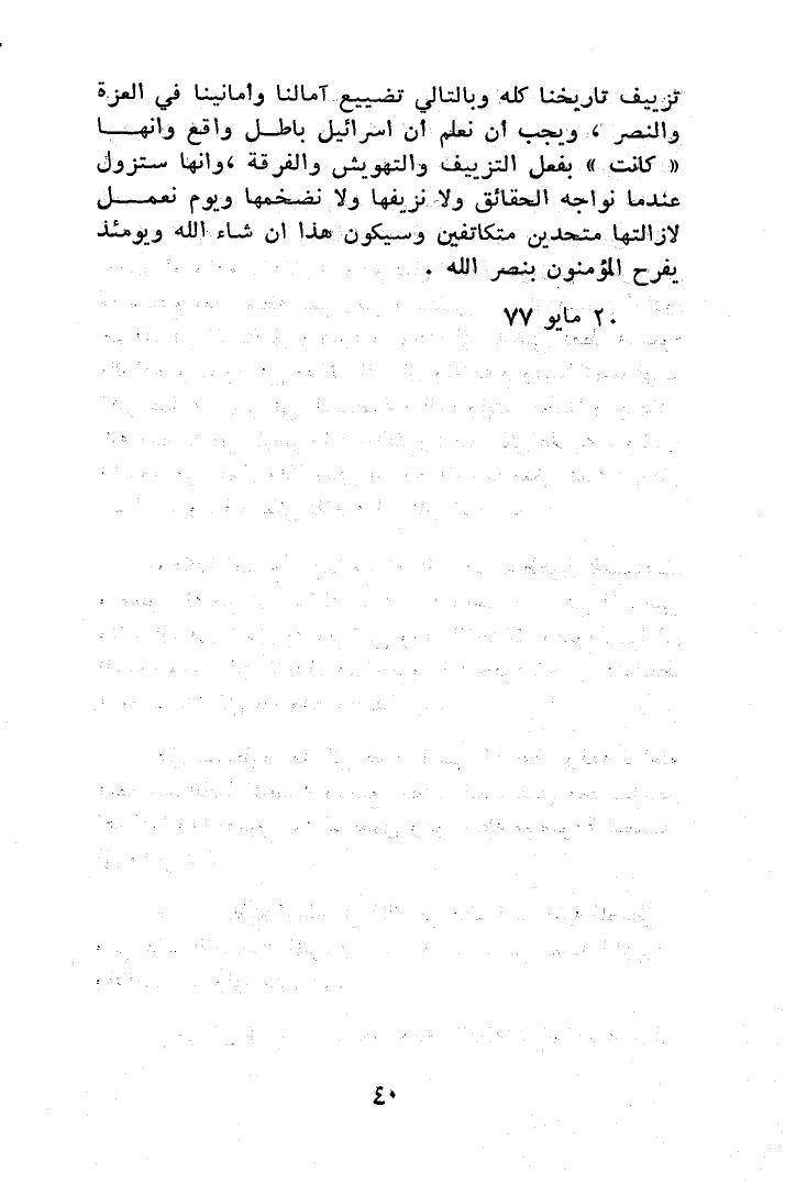 تزييف كل تاريخنا كله وبالتالي تضيع آمالنا وأمانينا في العزة والنصر، ويجب أن نعلم أن إسرائيل باطل واقع وأنها "كانت" بفعل التزييف والتهويش والفرقة، وأنها ستزول عندما نواجه الحقائق ولا نزيفها ولا نضخمها ويوم نعمل لإزالتها متحدين متكاتفين وسيكون هذا إن شاء الله ويومئذ يفرح المؤمنون بنصر الله.