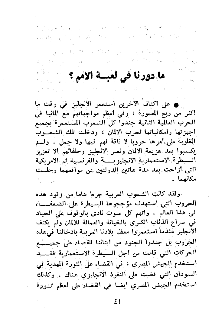 ولقد كانت الشعوب العربية جزءاً مهماً من وقود هذه الحروب التي استهدف مؤججوها السيطرة على الضعفاء في هذا العالم، وأتهم كل صوت نادى بالوقوف على الحياد في صراع الذئاب الكبرى بالخيانة والعمالة للألمان ولم يكتف الإنجليزي عندما استعمروا معظم بلادنا العربية بإدخالنا في هذه الحروب، بل جندوا الجنود من أبنائنا للقضاء على جميع الحركات التي قامت من أجل السيطرة الاستعمارية، فقد استخدم الجيش المصري، في القضاء على الثورة المهدية في السودان التي قضت على النفوذ الإنجليزي هناك، وكذلك استخدم الجيش المصري أيضاً في القضاء على أعظم ثورة