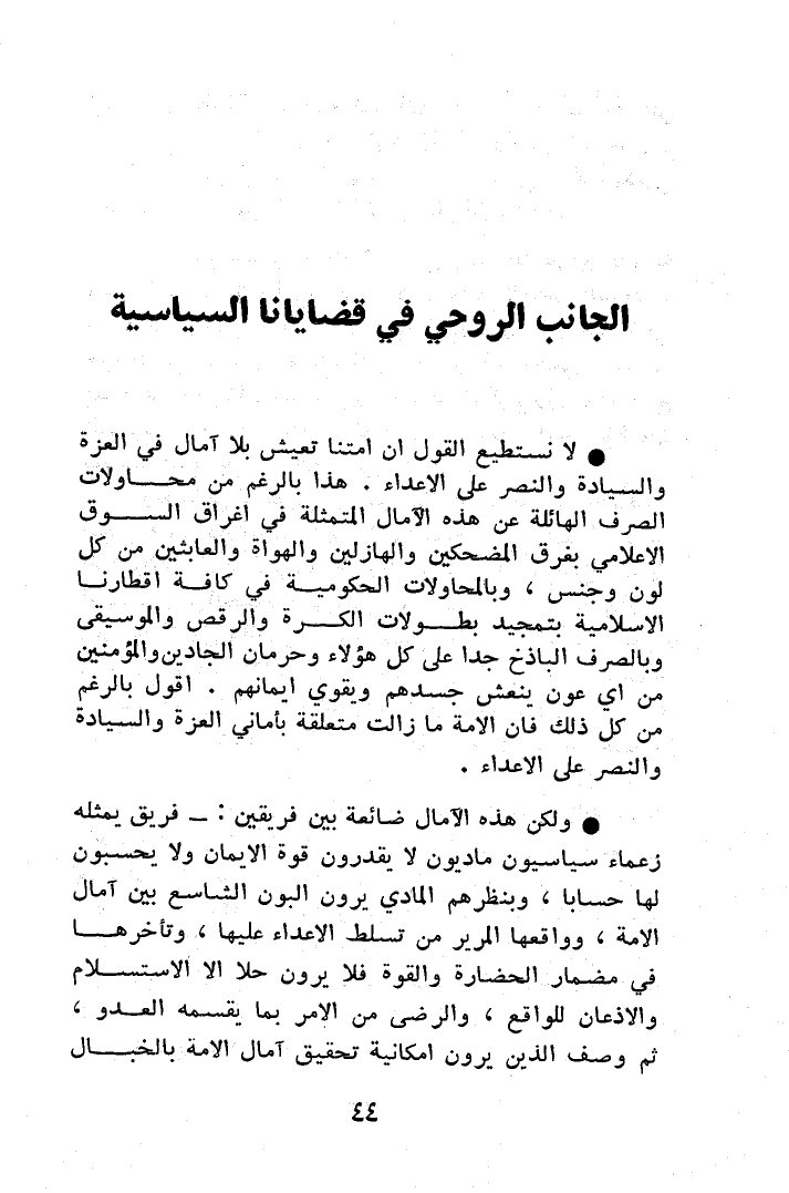 * ولكن هذه الآمال ضائعة بين فريقين: فريق يمثله زعماء سياسيون ماديون لا يقدرون قوة الإيمان ولا يحسبون لها حساباً، وبنظرهم المادي يرون البون الشاسع بين آمال الأمة، وواقعها المرير من تسلط الأعداء عليها، وتأخرها في مضمار الحضارة والقوة فلا يرون حلاً إلا الاستسلام والإذعان للواقع، والرضى من الأمر بما يقسمه العدو، ثم وصف الذين يرون إمكانية تحقيق آمال الأمة بالخبال