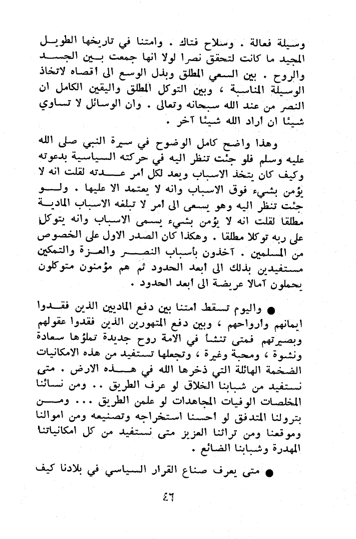 * واليوم تسقط أمتنا بين دفع الماديين الذين فقدوا إيمانهم وأرواحهم، وبين دفع المتهورين الذين فقدوا عقولهم وبصيرتهم فمتى تنشأ في الأمة روح جديدة تملؤها سعادة ونشوة، ومحبة وغيرة، وتجعلها تستفيد من هذه الإمكانيات الضخمة الهائلة التي ذخرها الله في هذه الأرض، متى نستفيد من شبابنا الخلاق لو عرف الطريق.. ومن نسائنا المخلصات الوفيات المجاهدات لو علمن الطريق.. ومن بترولنا المتدفق لو أحسنا استخراجه وتصنيعه ومن أموالنا وموقعنا ومن تراثنا العزيز متى نستفيد من كل إمكانياتنا المهدرة وشبابنا الضائع.