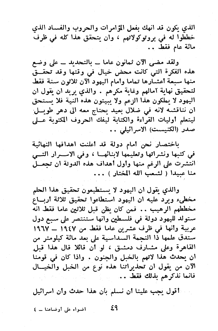 ولقد مضى الآن ثمانون عاماً -بالتحديد- على وضع هذه الفكرة التي كانت محض خيال في وقتها وقد تحقق منها سبعة أعشارها تماماً وأمام اليهود الآن ثلاثون سنة فقط لتحقيق نهاية آمالهم وغاية مكرهم، والذي يريد أن يقول إن اليهود لا يملكون هذا الزعم ولا يبيتون هذه النية فلا يستحق أن نناقشه لأنه في ضلال بعيد يحتاج معه إلى دهر طويل ليتعلم أوليات القراءة والكتابة ليفك الحروف المكتوبة على صدر (الكنيست) الإسرائيلي.