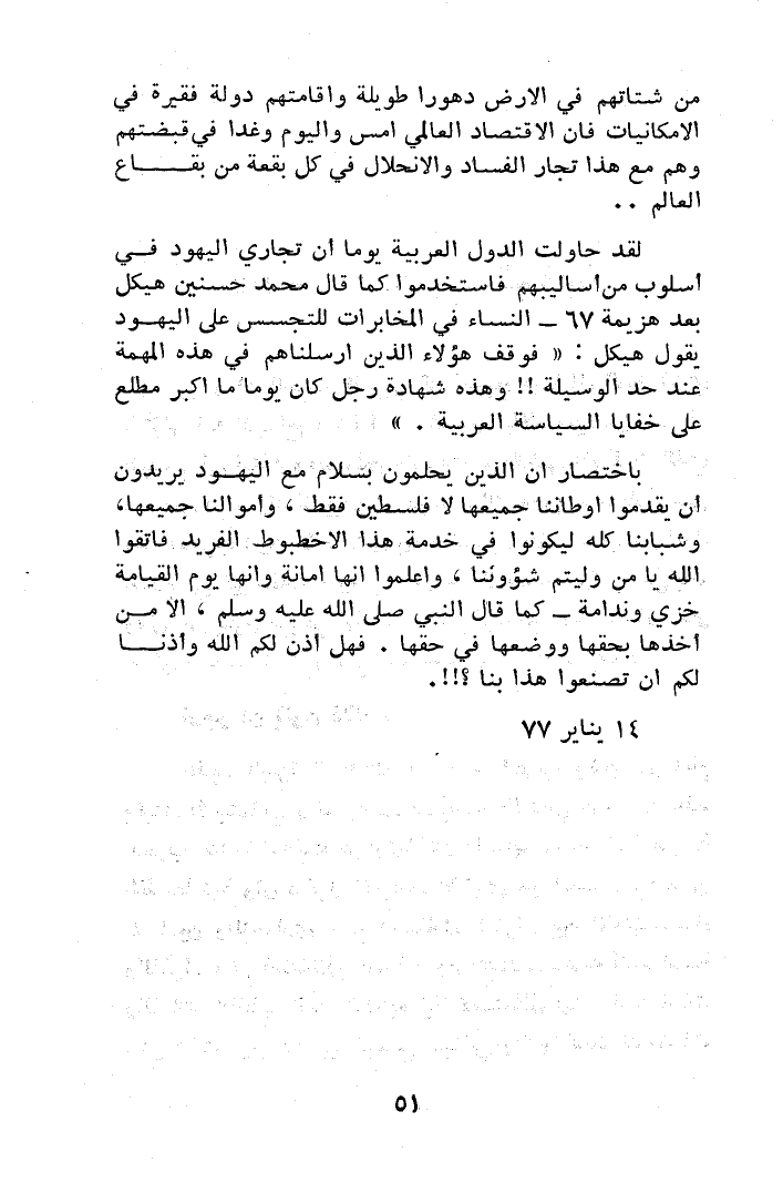 باختصار، إن الذين يحلمون بسلام مع اليهود يريدون أن يقدموا أوطاننا جميعها لا فلسطين فقط، وأموالنا جميعها، وشبابنا كله ليكونوا في خدمة هذا الأخطبوط الفريد فاتقوا الله يا من وليتم شؤوننا، واعلموا أنها أمانة وأنها يوم القيامة خزي وندامة - كما قال النبي صلى الله عليه وسلم إلا من أخذها بحقها ووضعها في حقها، فهل أذن لكم الله وأذنا لكم أن تصنعوا هذا بنا؟!!