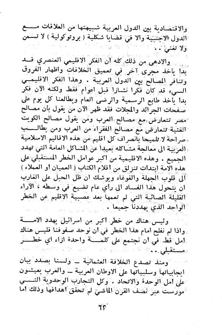والادهى من ذلك كله أن الفكر الإقليمي العنصري قد بدأ يأخذ مجرى آخر في تعميق الخلافات وإظهار الفروق وتنافر المصالح بين الدول العربية، وهذا الفكر الإقليمي السيء قد كان فكراً نشازاً قبل أعوام فقط، ولكنه الآن فكر بدأ يأخذ طابع الرسمية والرضى العام ويطالعنا كل يوم على صفحات الجرائد والمجلات فقد ظهر الآن من يقول بأن مصالح مصر تتعارض مع مصالح العرب، ومن يقول مصالح الكويت الغنية تتعارض مع مصالح الفقراء من العرب ومن يطالب صراحة لا تلميحاً بانصراف كل أقاليم من هذه الأقاليم الإسلامية العربية إلى معالجة مشاكله بعيداً عن المشاكل العامة التي تهدد الجميع، وهذه الإقليمية من أكبر عوامل الخطر المستقبلي على هذه الأمة ابتدأت تنزلق من أقلام الكتاب (العميان أو العملاء) إلى قلوب الجهلة والغوغاء ويوشك إن ظل الحبل على الغارب أن يتحول هذا الفساد إلى رأي عام تضيع في وسطه، الآراء القليلة الصائبة التي لم تعمها بعد عصبية الإقليم عن الخطر الواحد الذي يهددنا جميعاً.