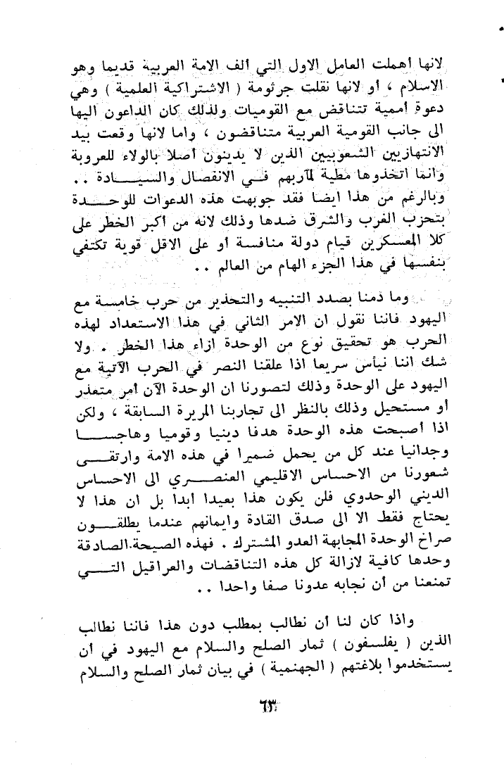 وإذا كان لنا أن نطالب بمطلب دون هذا فإننا نطالب الذين (يفلسفون) ثمار الصلح والسلام مع اليهود في أن يستخدمون بلاغتهم الجهنمية في بيان ثمار الصلح والسلام
